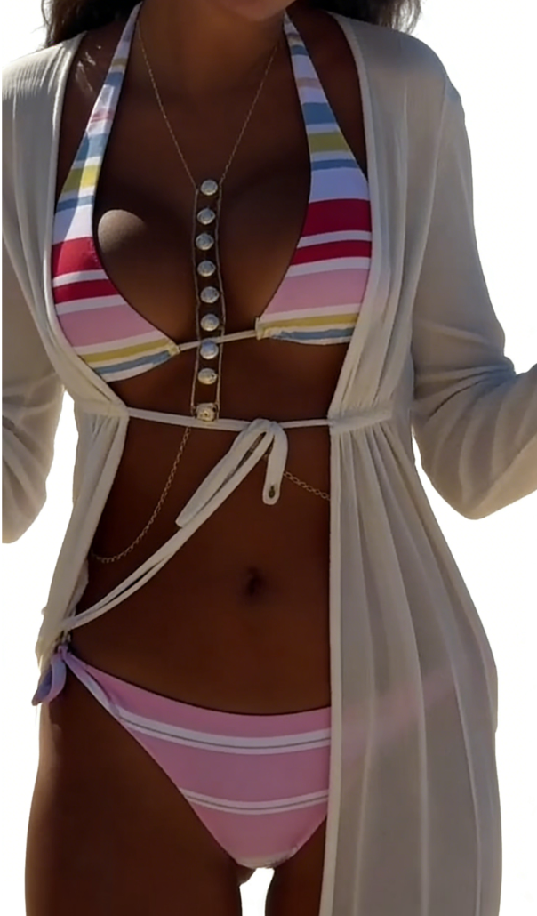 This multi-colored striped bikini set elevates your beach look with its playful pattern and easy layering options.