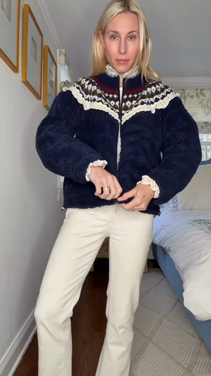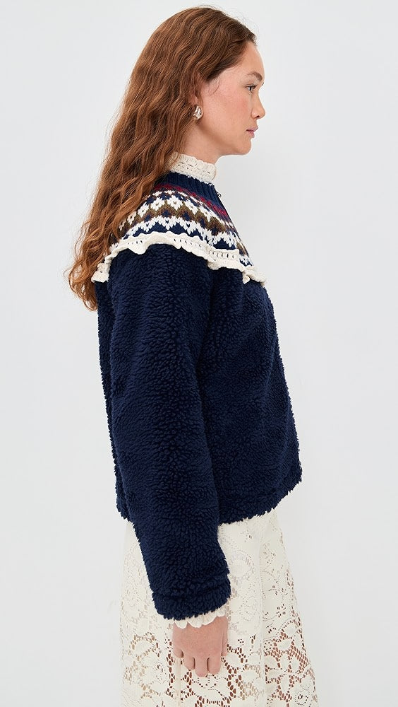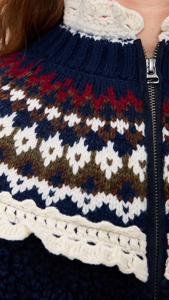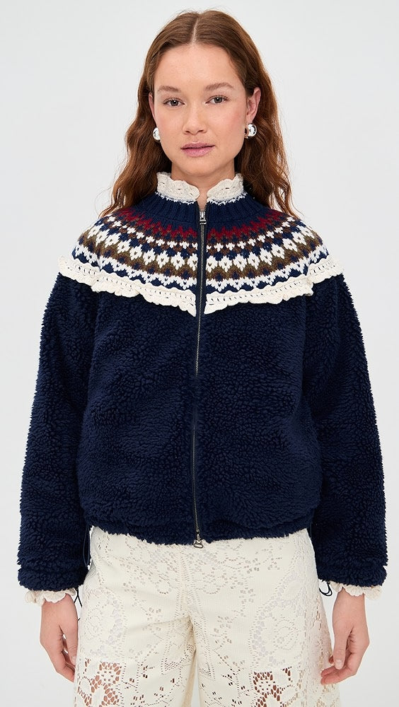 • Design: Navy Blue Sherpa Jacket with Nordic Pattern & Lace Trim