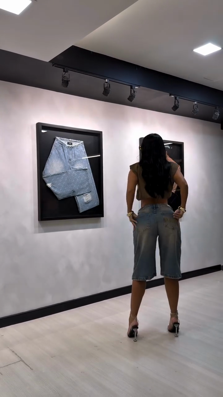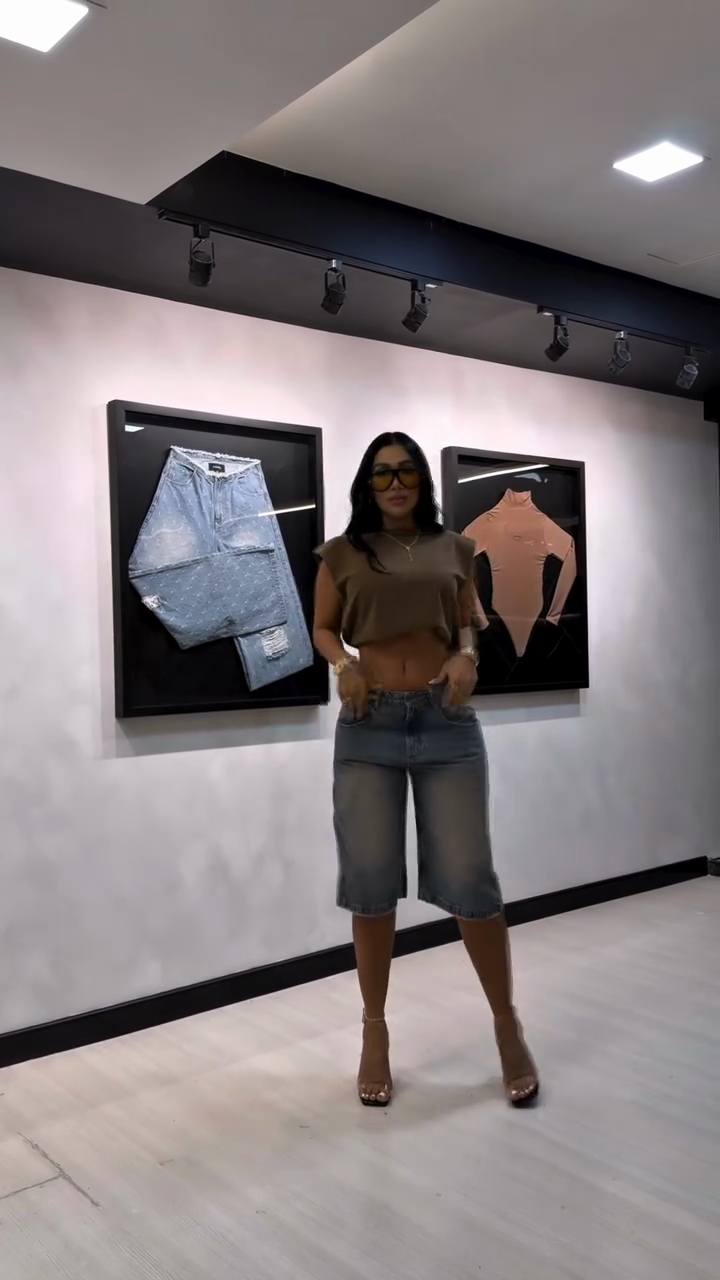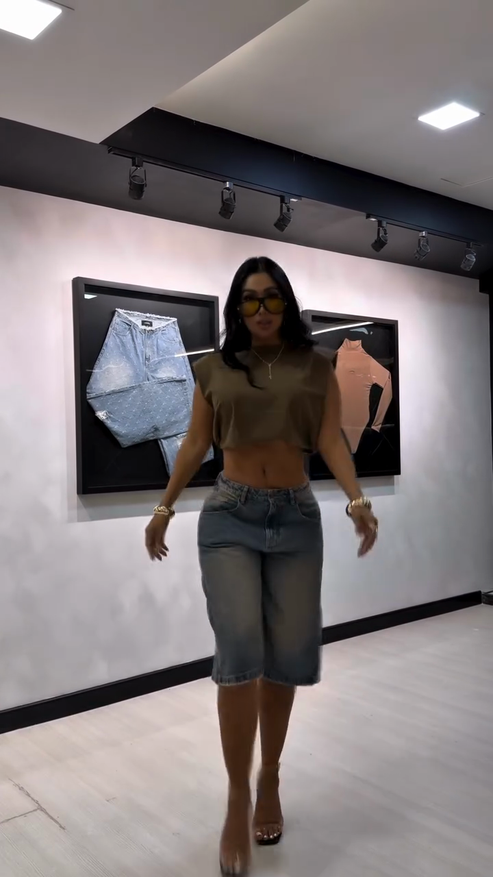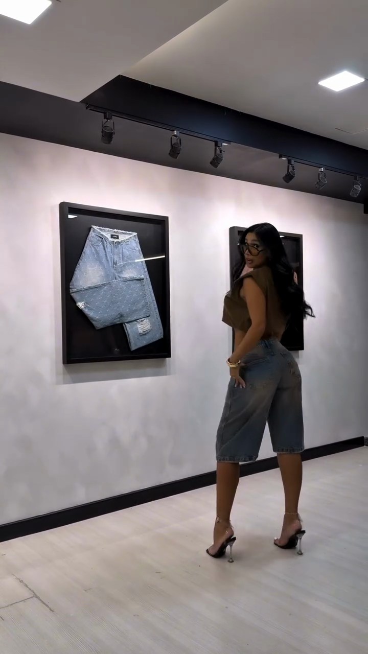 These denim shorts are made from washed and distressed denim, featuring a relaxed fit, high waist, and frayed hem. Pair them with a cropped top and platform sandals for an effortlessly stylish look.