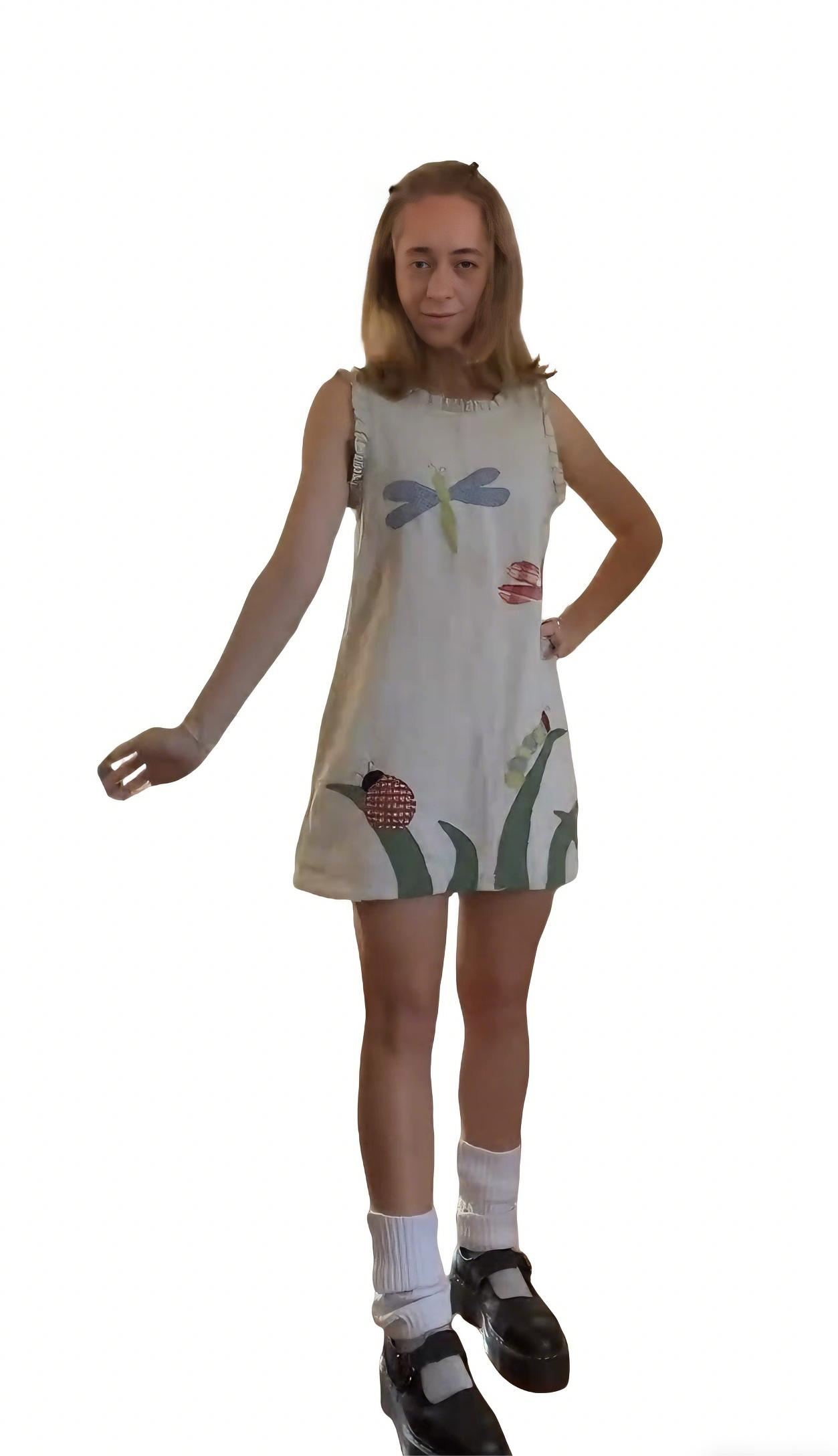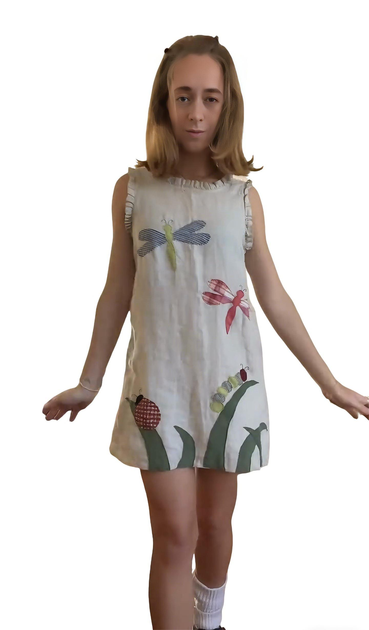 This pastel insect print sleeveless mini dress elevates a playful and casual look with its whimsical details and relaxed, comfortable charm.