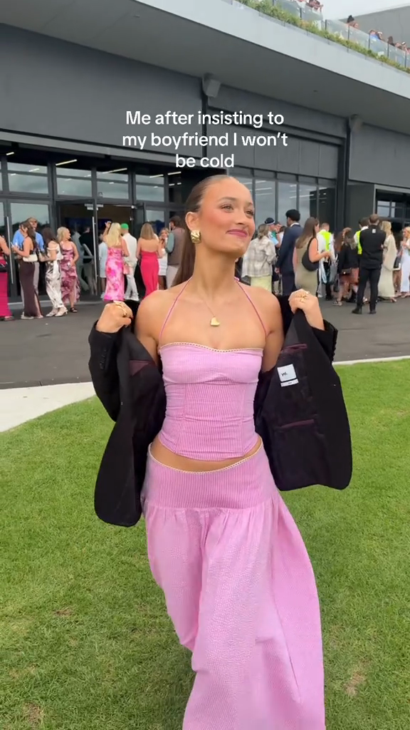 A two-piece pink co-ord featuring a halter corset top and flowy maxi skirt, merging feminine structure with romantic volume for semi-formal or trendy casual styling.