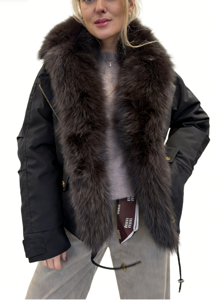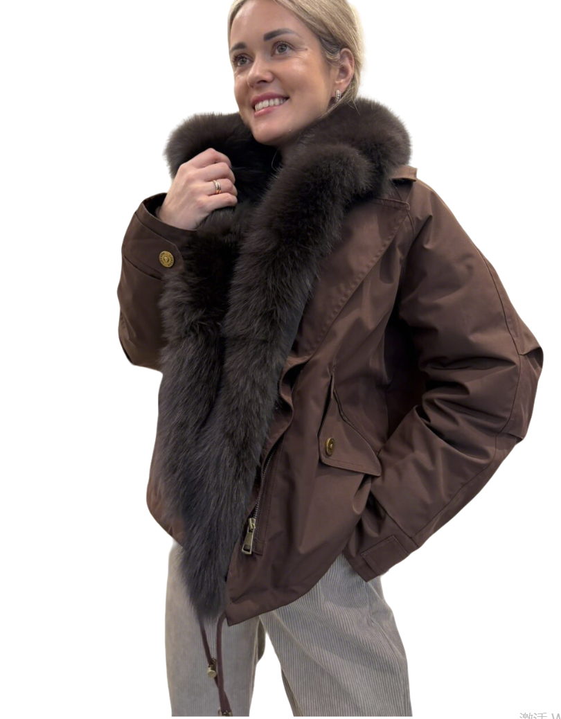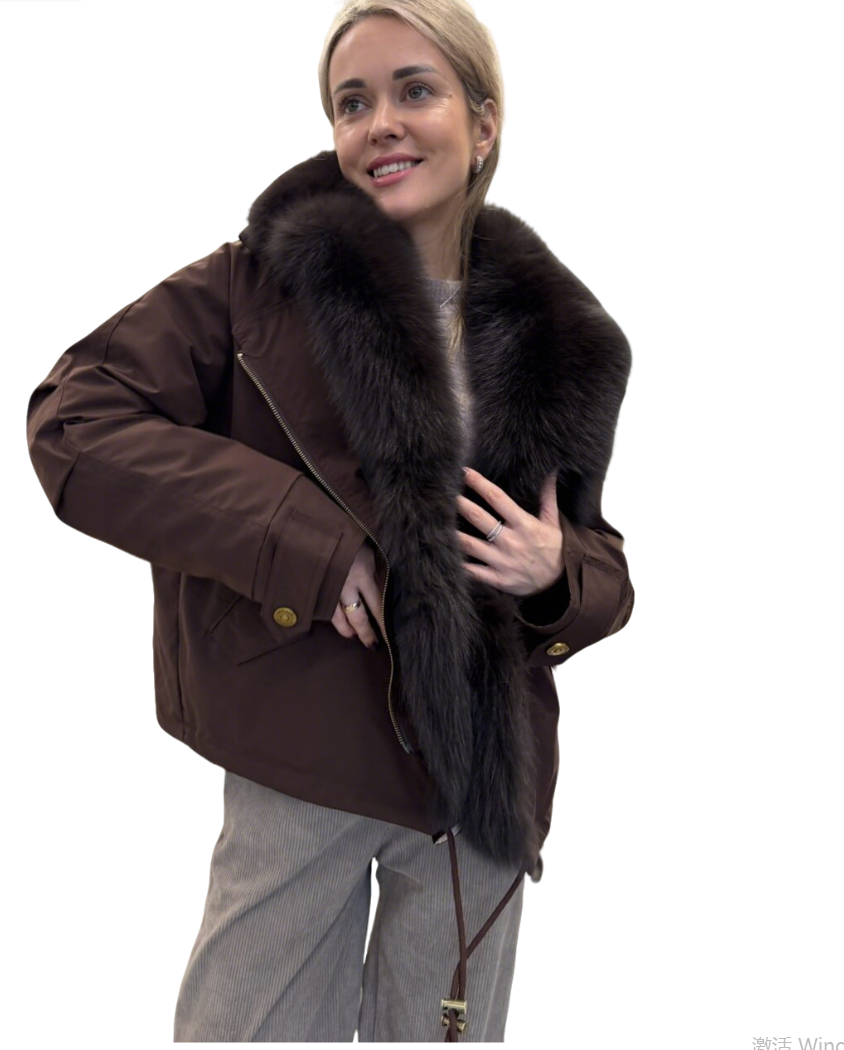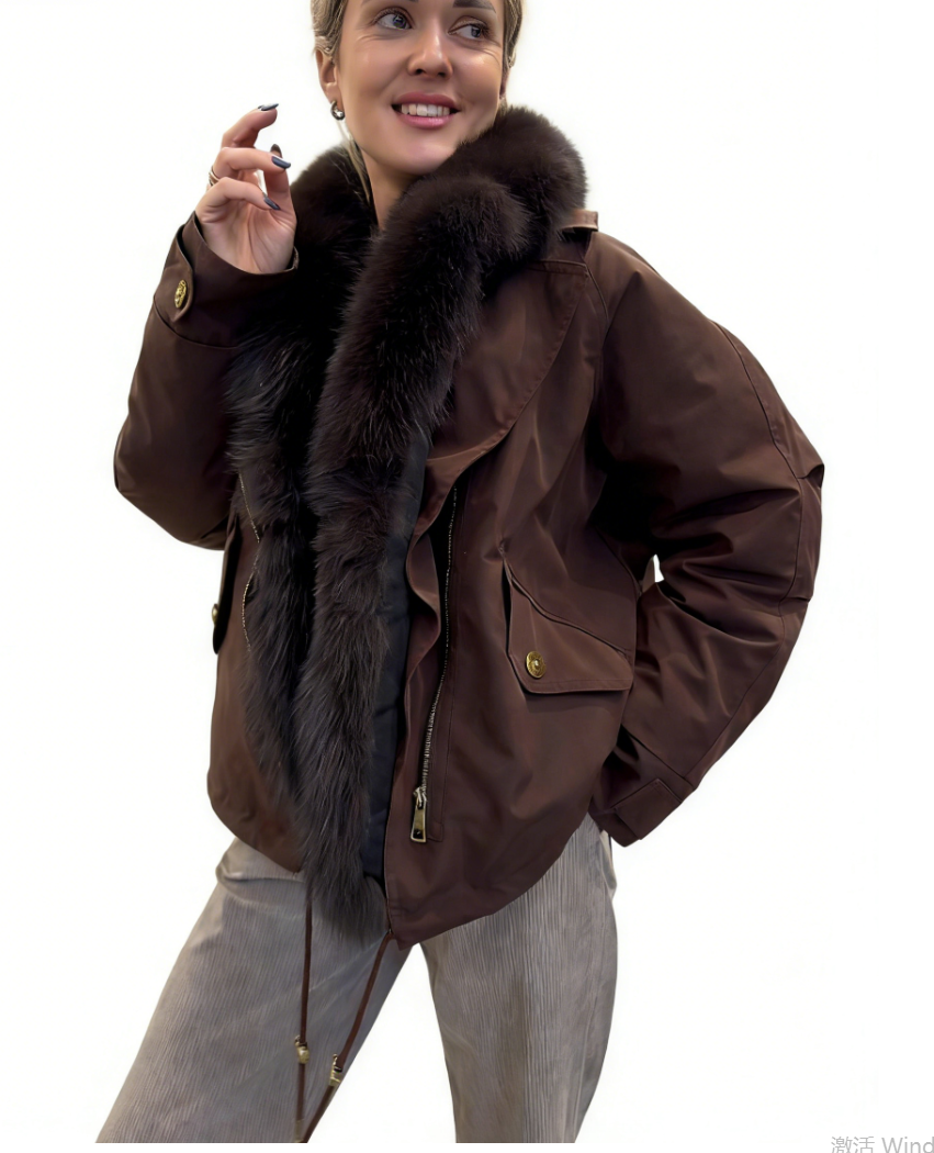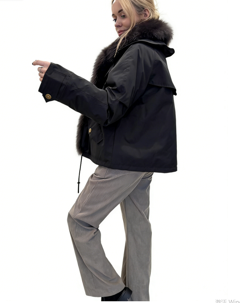 A  utility-style jacket featuring a large plush fur collar, decorative metal buttons, and a relaxed silhouette—merging durable outerwear fabric with luxurious fur details for winter upscale casual or urban styling.