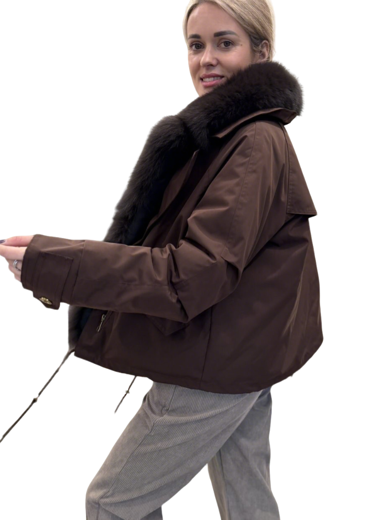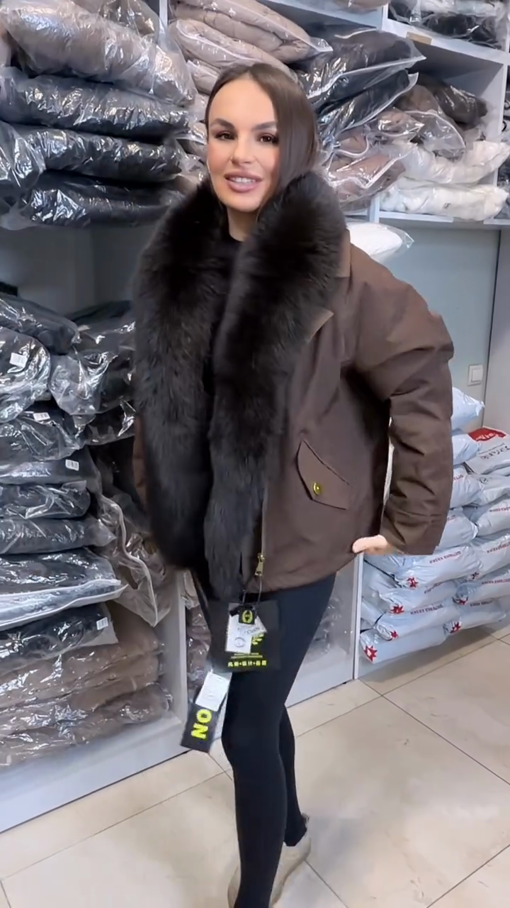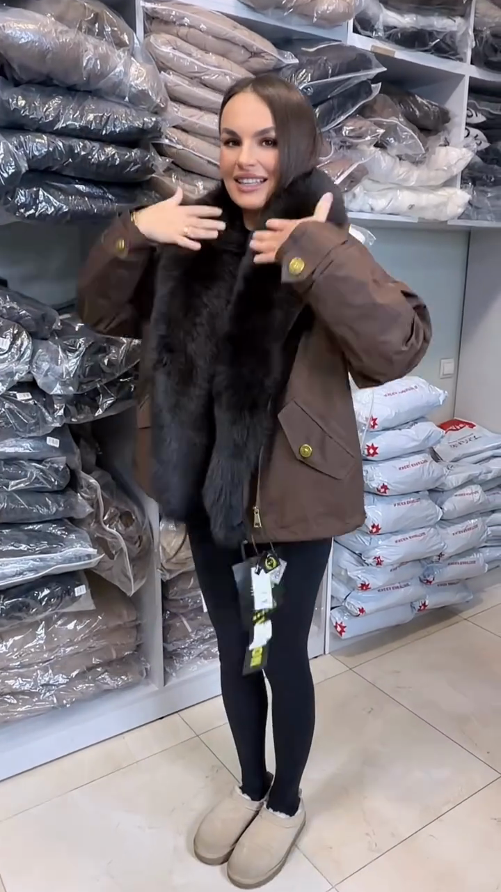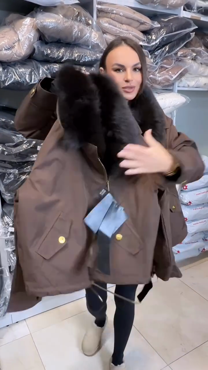 A  utility-style jacket featuring a large plush fur collar, decorative metal buttons, and a relaxed silhouette—merging durable outerwear fabric with luxurious fur details for winter upscale casual or urban styling.