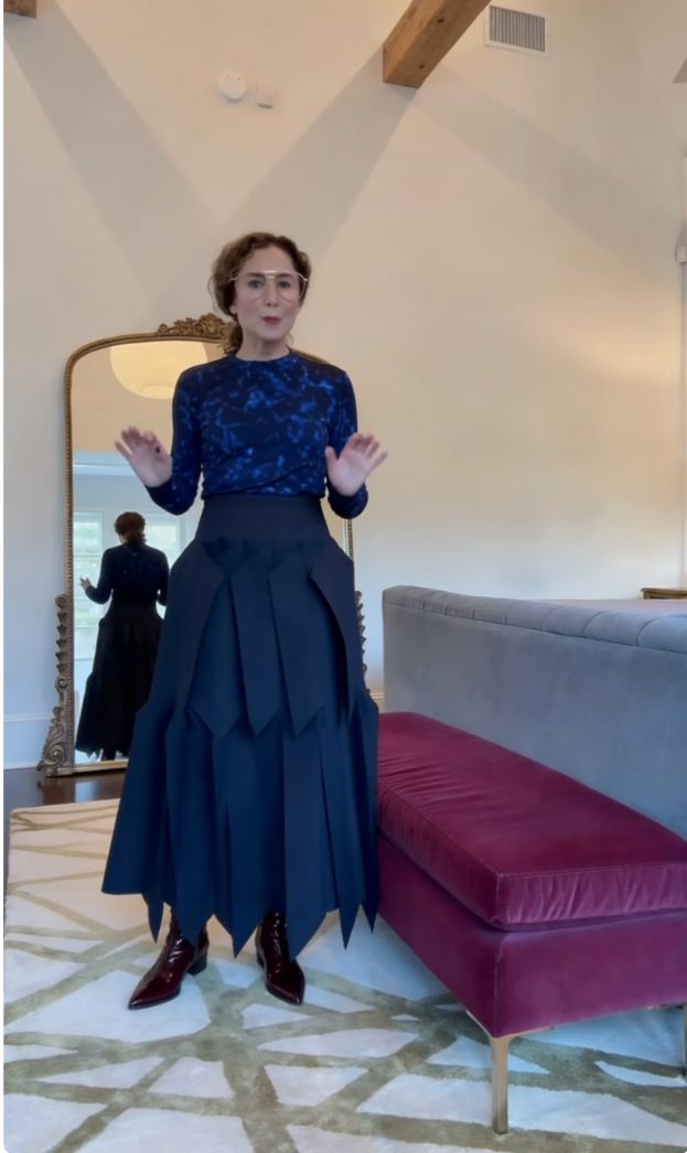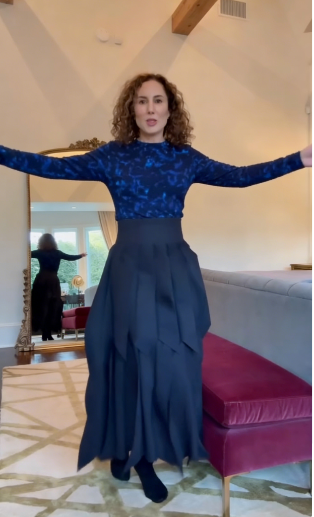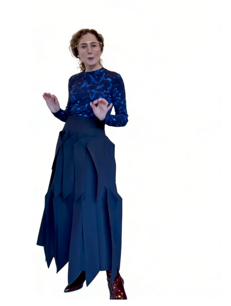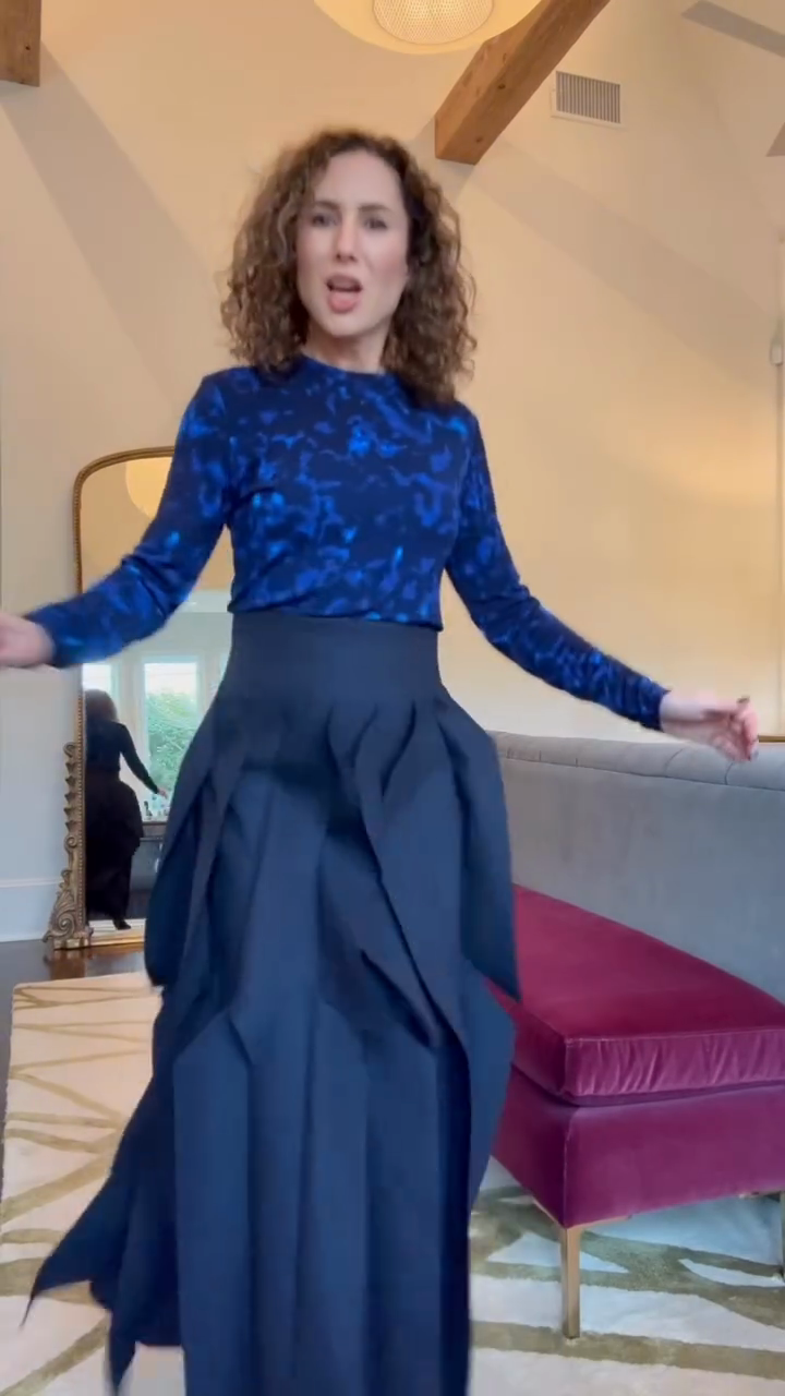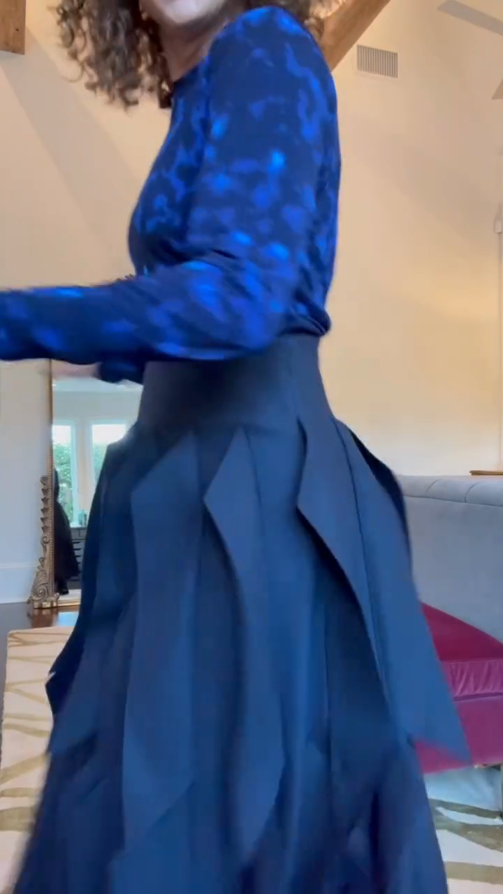 A two-piece set (long-sleeve top + midi skirt) featuring a navy blue starry print top and an asymmetric layered midi skirt—merging delicate printed fabric with structured, artistic skirt details for upscale casual or artistic social styling.