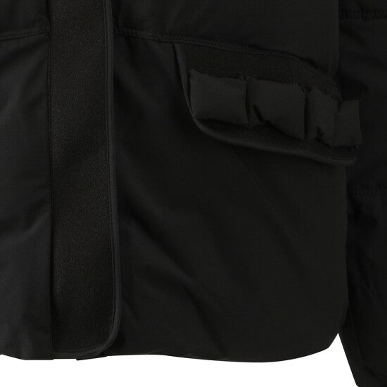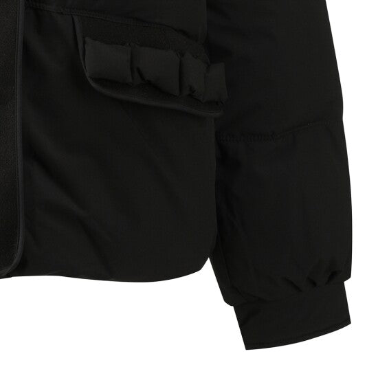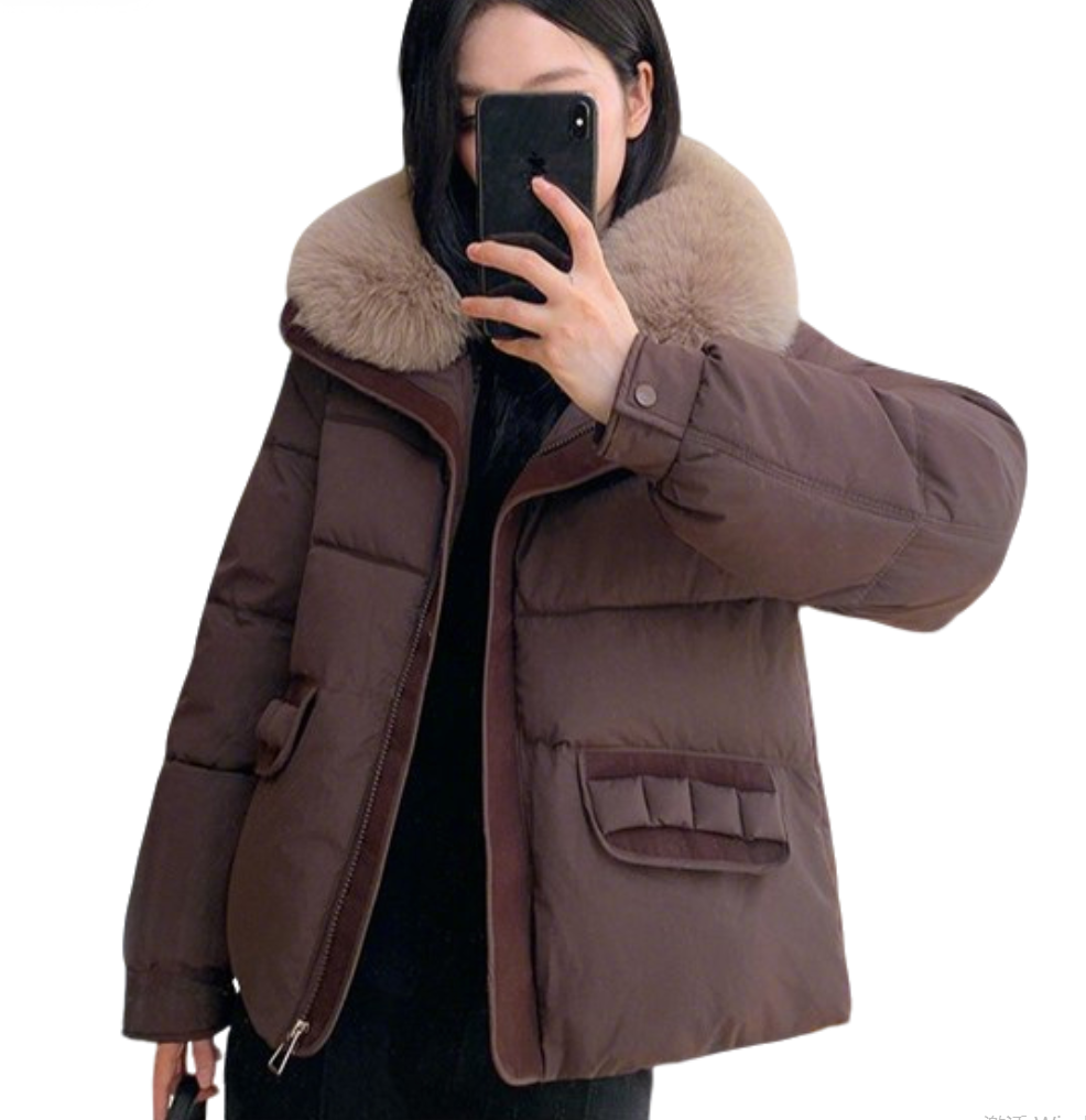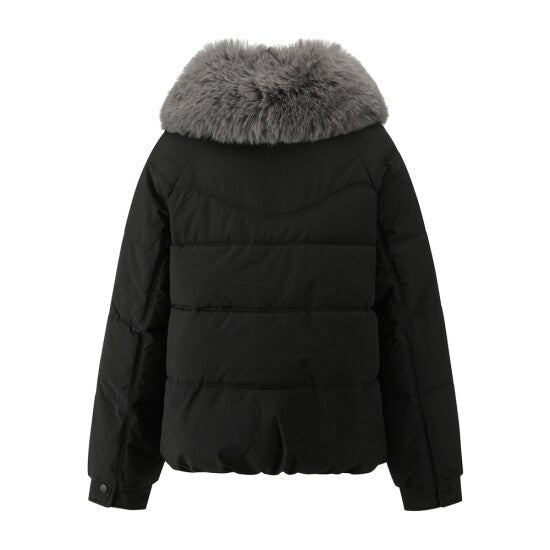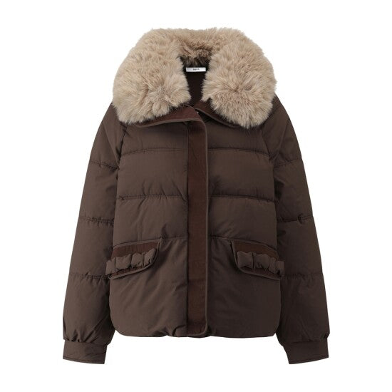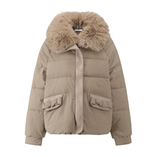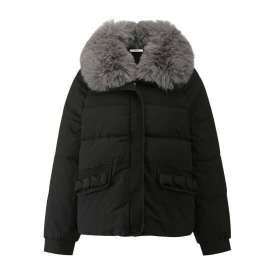 A puffer jacket featuring a large plush fur collar, decorative bow pockets, and a relaxed silhouette—merging lightweight down-filled warmth with soft texture details for winter casual or daily styling.