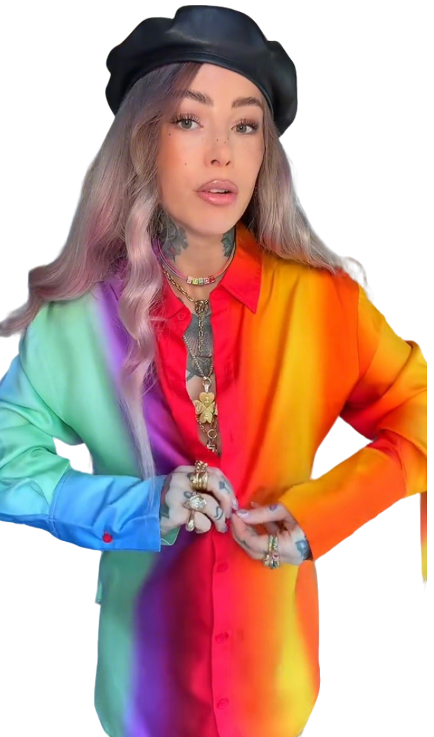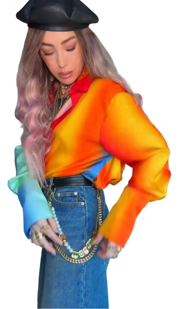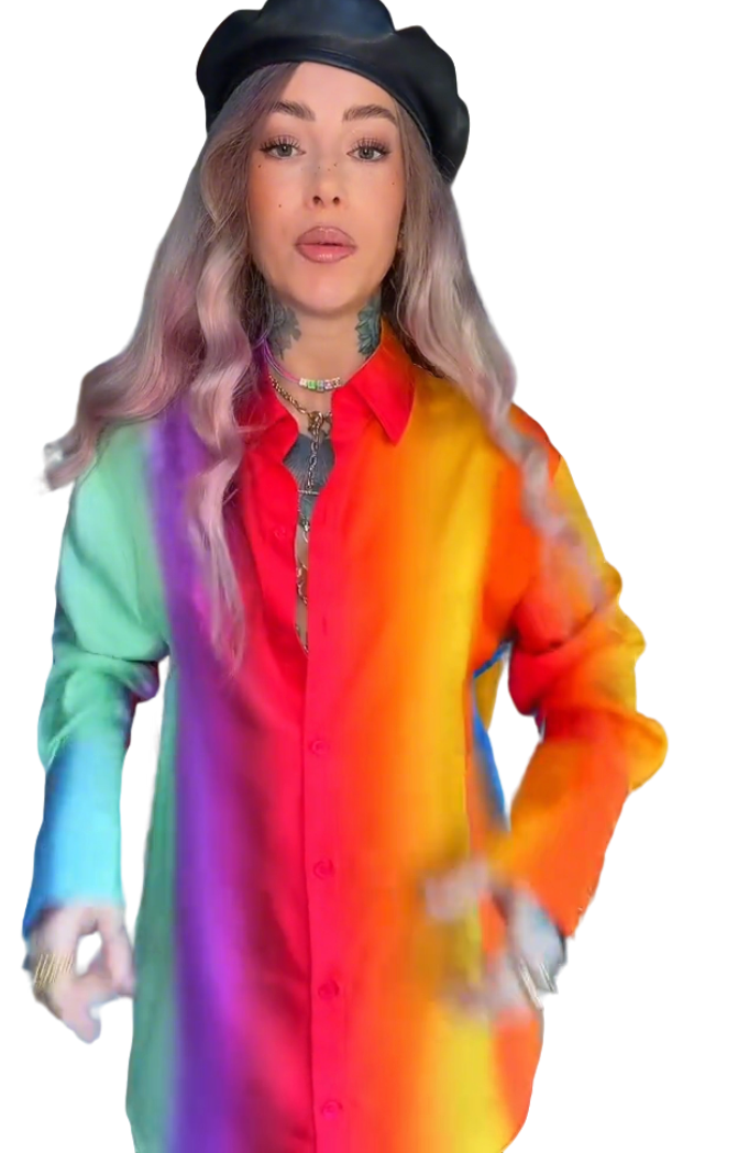 A rainbow-gradient oversized shirt featuring a collared design and a back cutout detail—merging smooth fabric texture with bold color elements for statement casual or street-style styling.