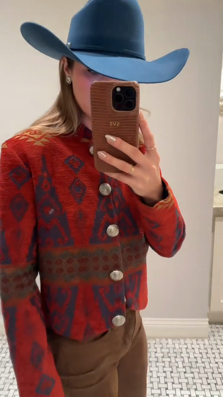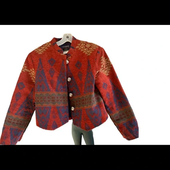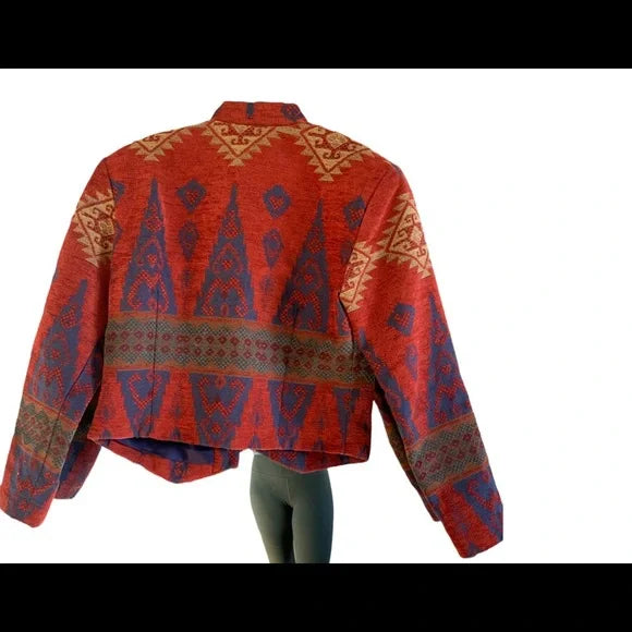 A retro ethnic-pattern cropped jacket in textured woven fabric (red and blue geometric print, stand collar, pearl button closure). Blends vintage ethnic charm with compact cropped design, fitting retro-themed outfits, casual gatherings or daily layered styling—pair with high-waisted bottoms to highlight the cropped silhouette.