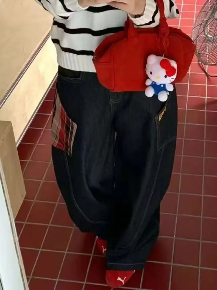 These wide-leg jeans combine retro plaid patchwork with classic denim, creating a unique and trendy piece that stands out. The relaxed fit and high-waist design provide a flattering silhouette, making these pants a comfortable yet stylish choice. Perfect for a casual day out or a chic urban look, these jeans effortlessly blend vintage charm with modern design.