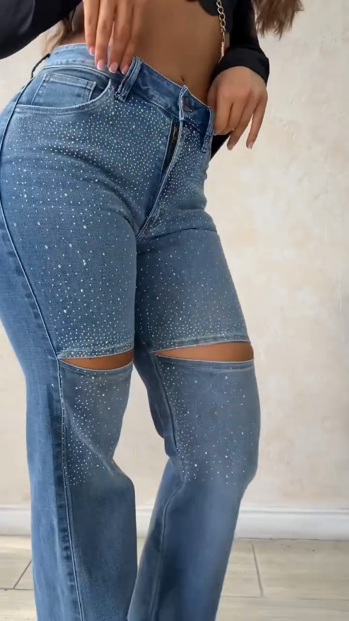 A light-wash flared jeans featuring full-body white rhinestone embellishments and thigh cutouts. It merges "glamorous sparkle detail" (rhinestone studs) with "edgy casual design" (thigh cutouts + flared silhouette)—aligning with nightlife outings, street-style looks, or trendy casual gatherings.
