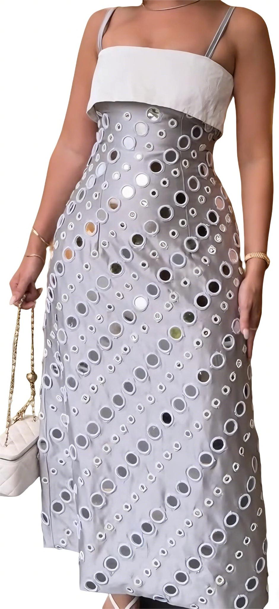 This midi dress, adorned with round mirror embellishments, adds a touch of playfulness yet elegance with its unique texture and effortless eye-catching charm.