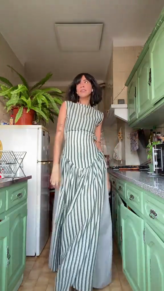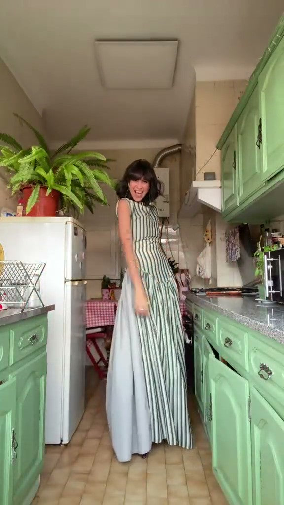 This light green striped dress features a sleeveless round neckline, a fitted waist, and a flowing pleated maxi skirt. Paired with deep purple heels and drop earrings, it exudes elegance.