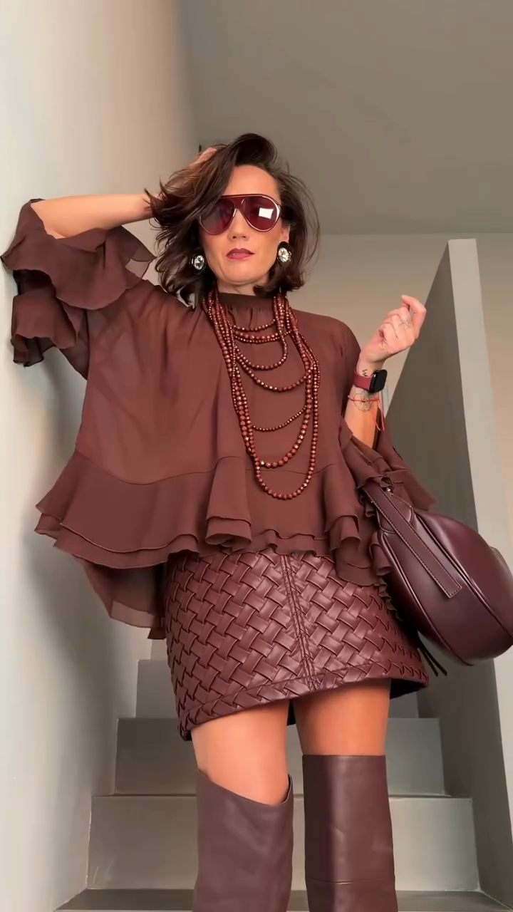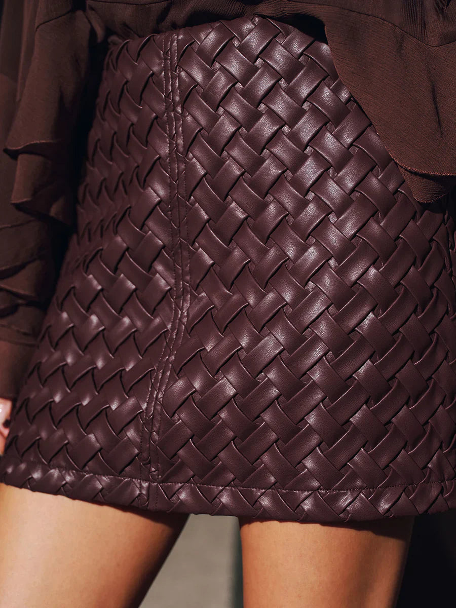 A chocolate brown sheer blouse & burgundy woven leather skirt set crafted from lightweight sheer fabric  and textured woven leather—the blouse features romantic ruffled cuffs, while the skirt showcases a classic interwoven pattern . Blends soft feminine detailing with sleek luxury texture, fitting evening outings, urban nightlife looks or polished date-night styling