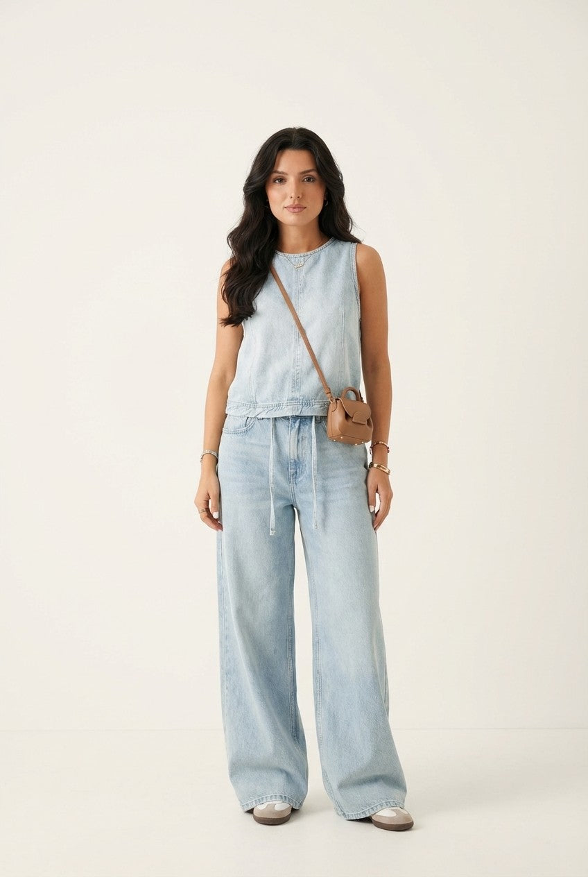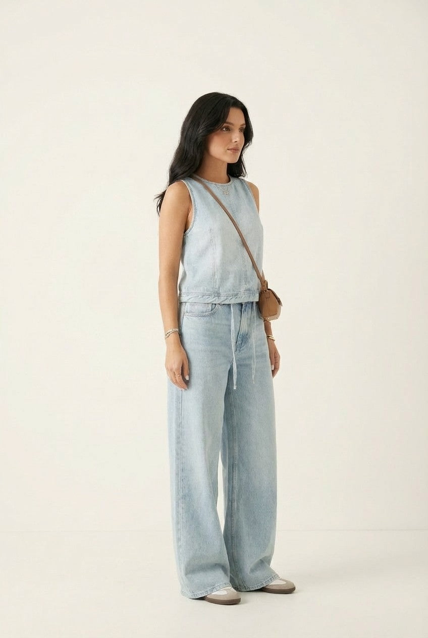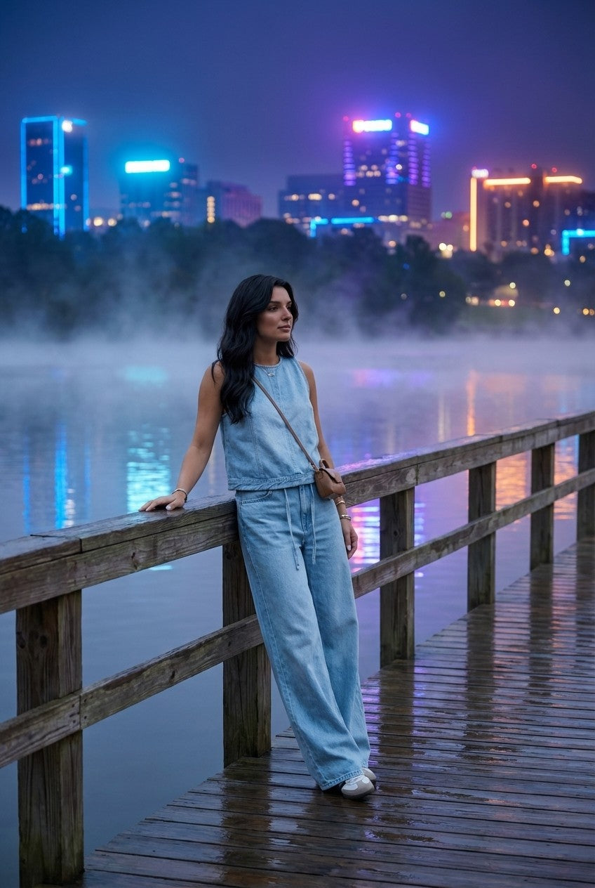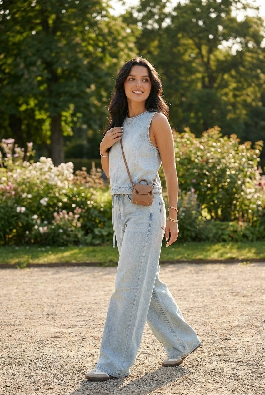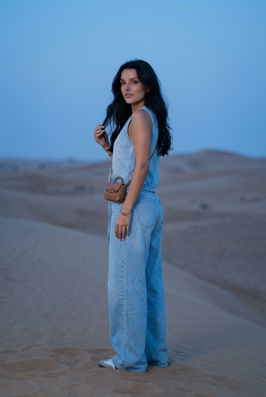 This denim-inspired two-piece set blends relaxed tailoring with modern minimalism, creating a look that feels both polished and easygoing.