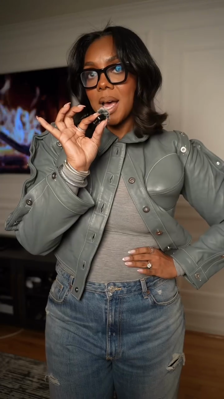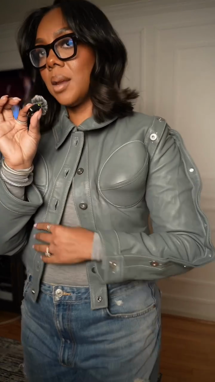 ✅ Short silhouette + button front + padded shoulders create a slim and structured shape. ✅ Understated slate gray tone exudes a sophisticated and versatile style.