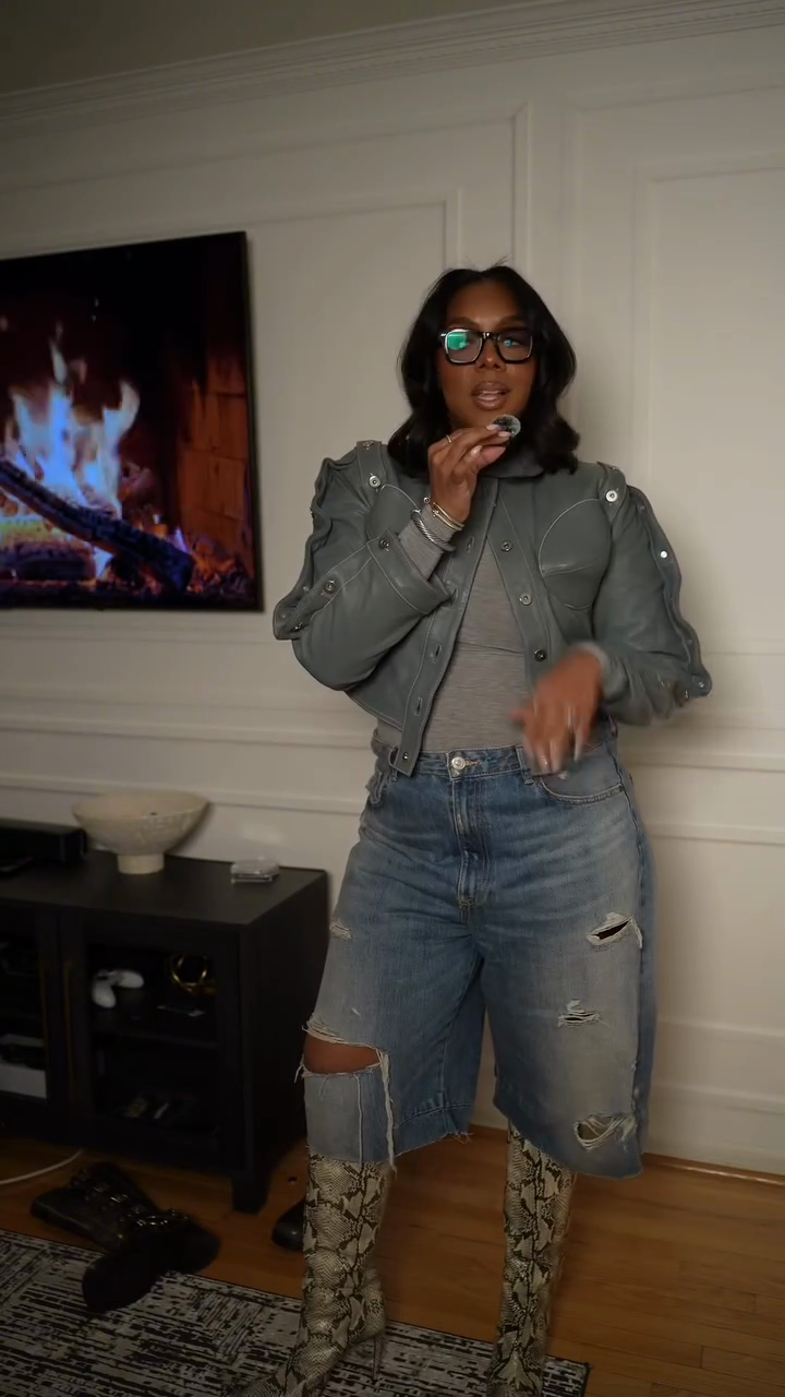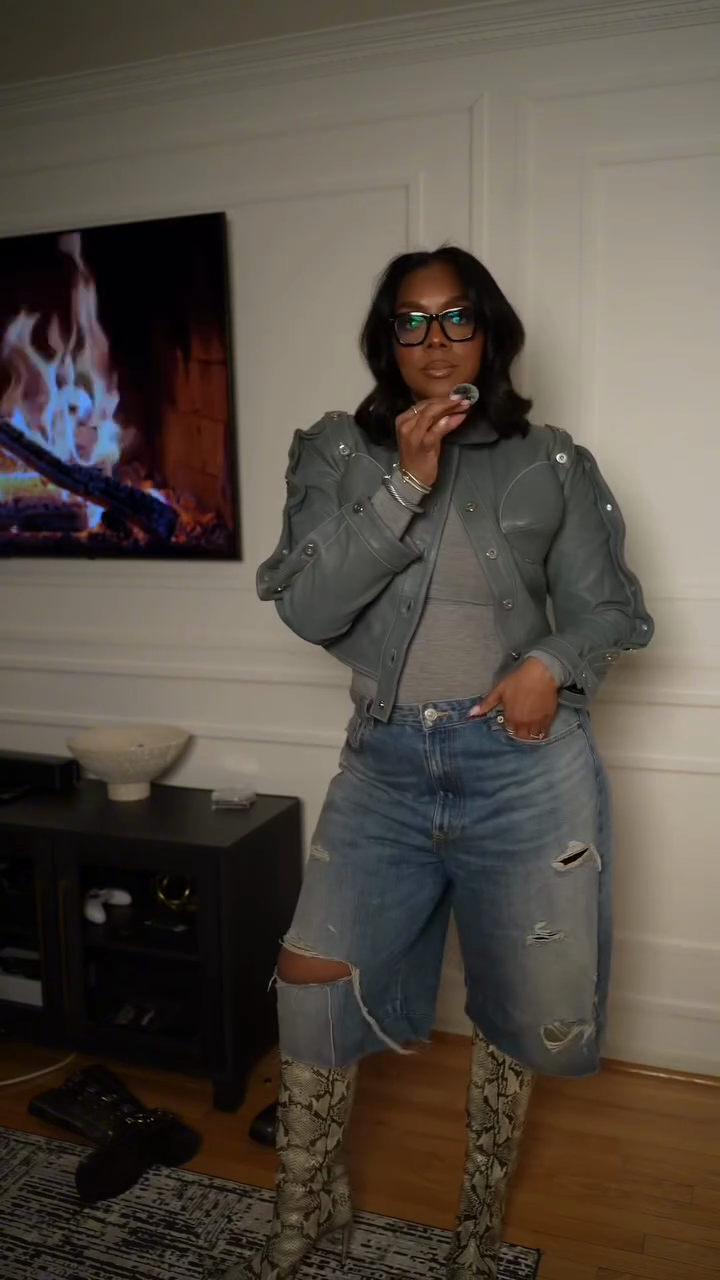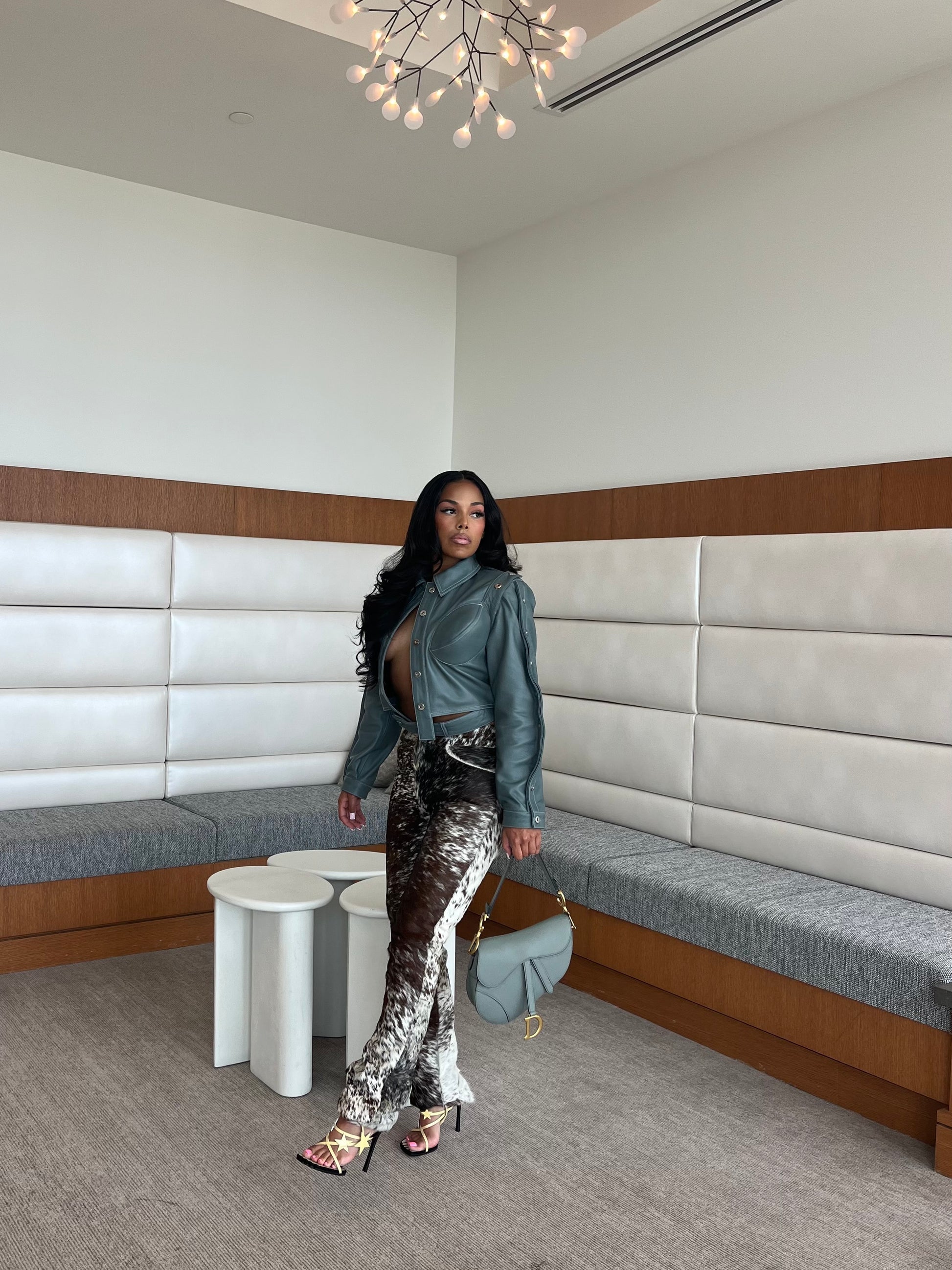 This slate grey short faux leather bomber jacket elevates the overall stylish and edgy look with its smooth texture and effortless modern charm.