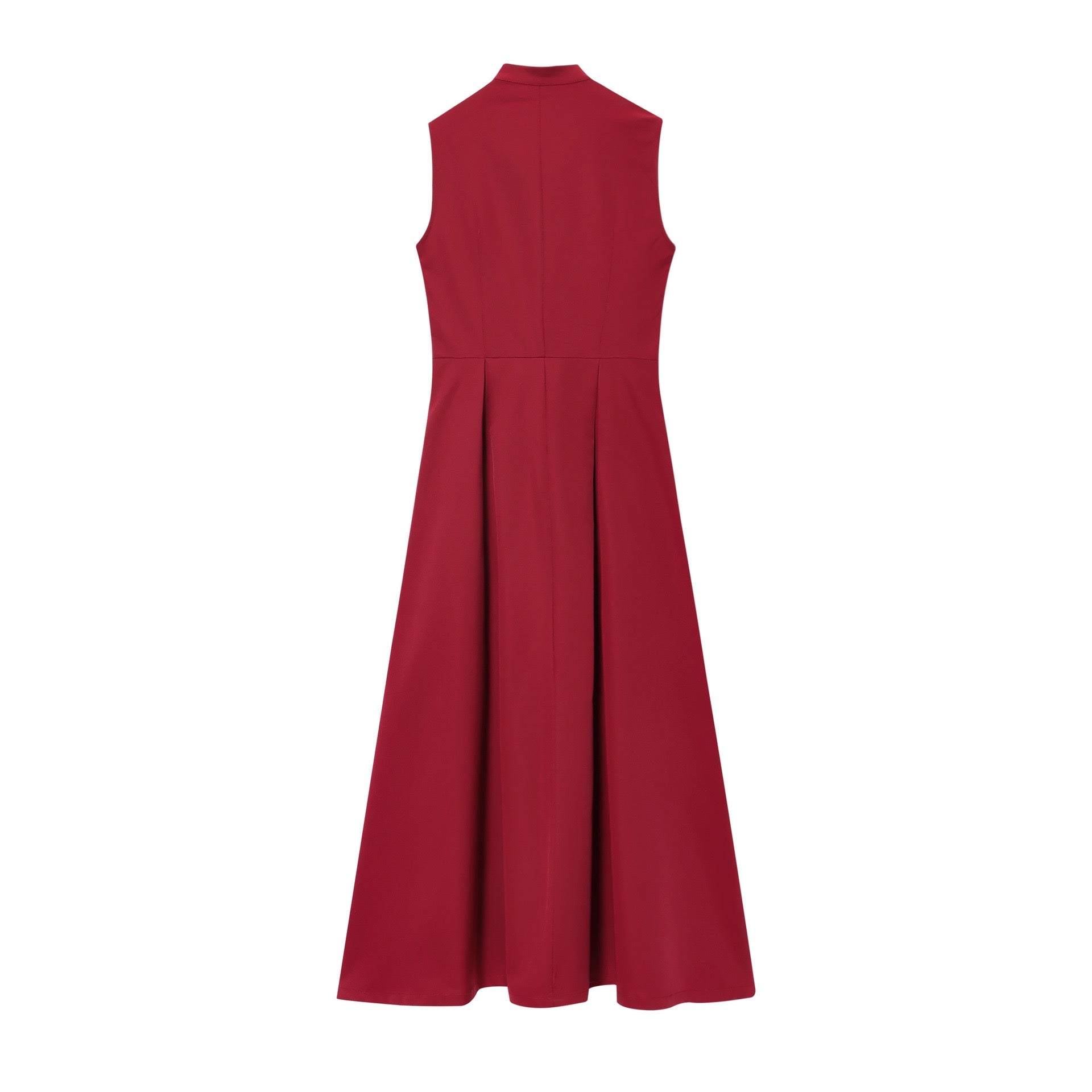 This sleeveless, stand-up collar, zip-up midi dress features a simple cut that exudes elegance and aims to enhance the overall sense of style and sophistication.