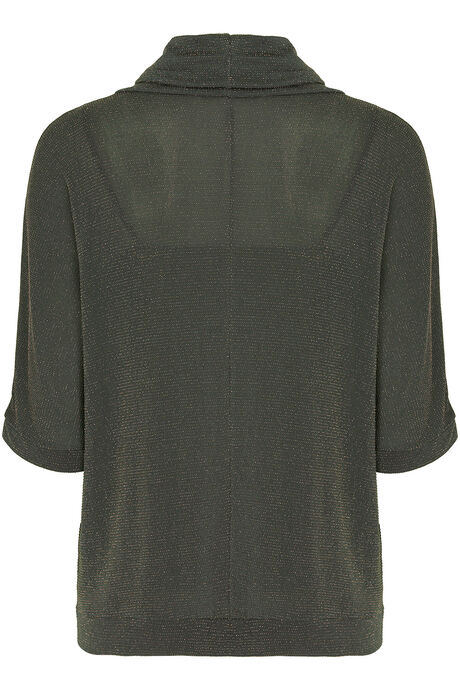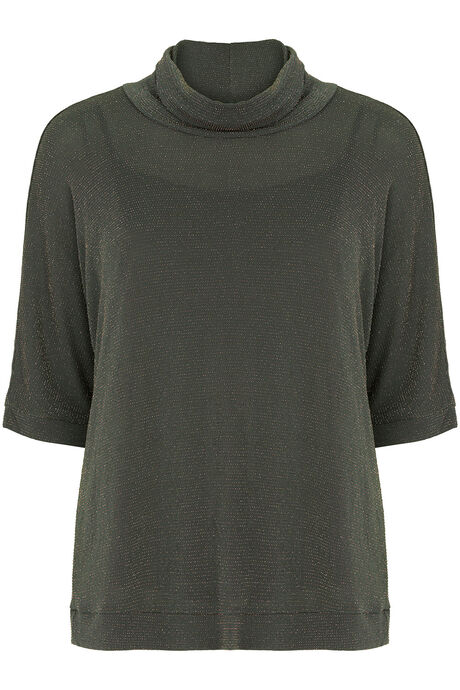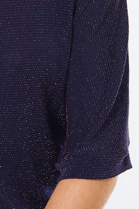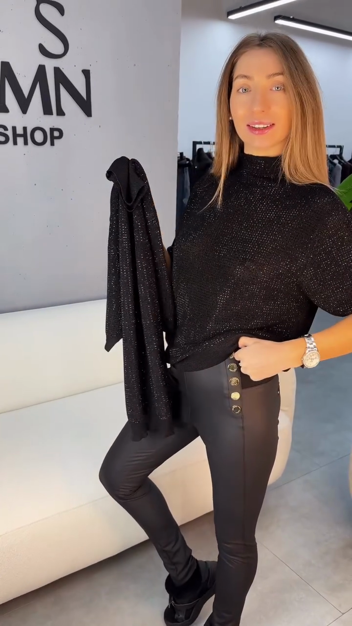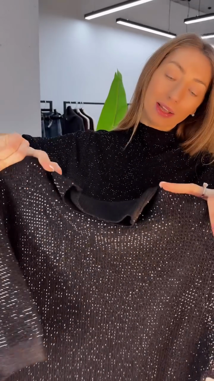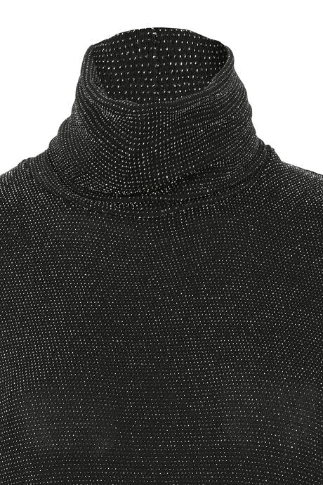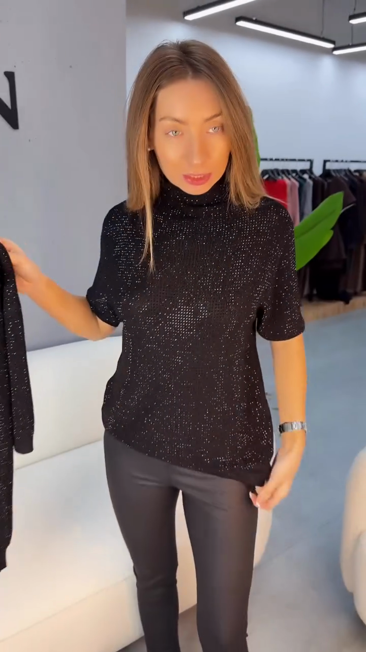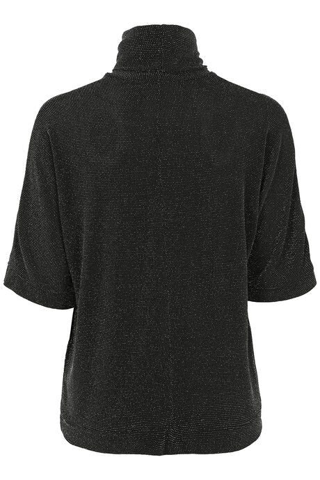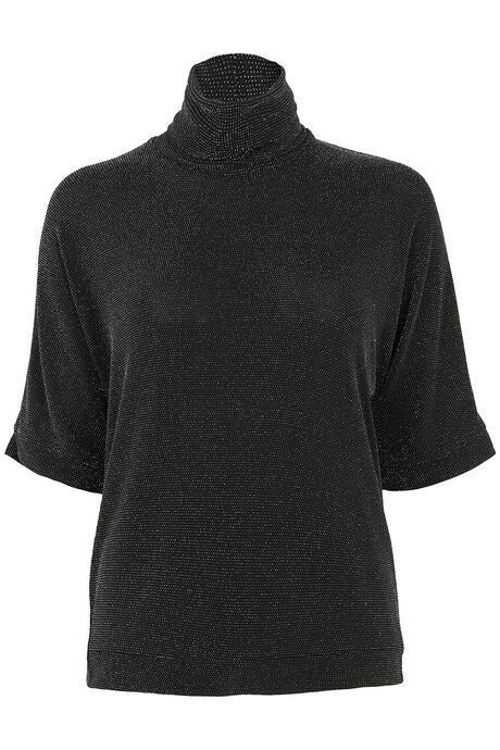 A black turtleneck top featuring subtle sparkle texture and relaxed half-sleeve design—merging soft fabric with shimmering details for elegant casual or evening styling.