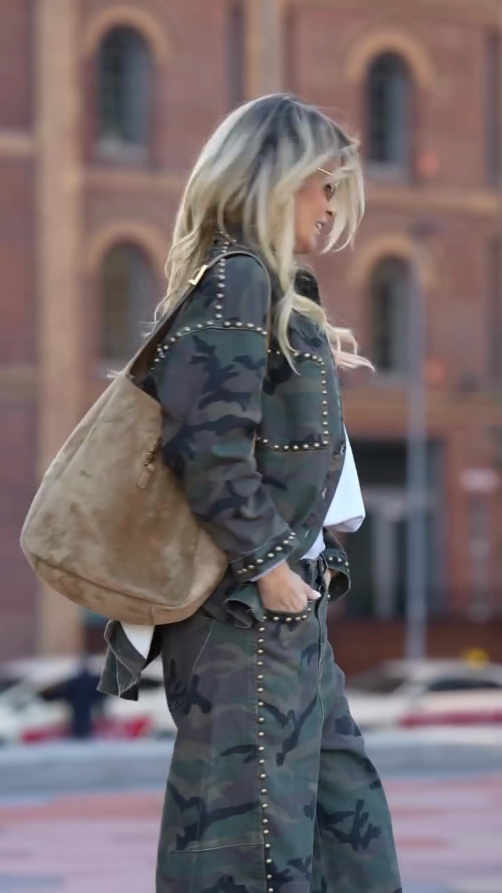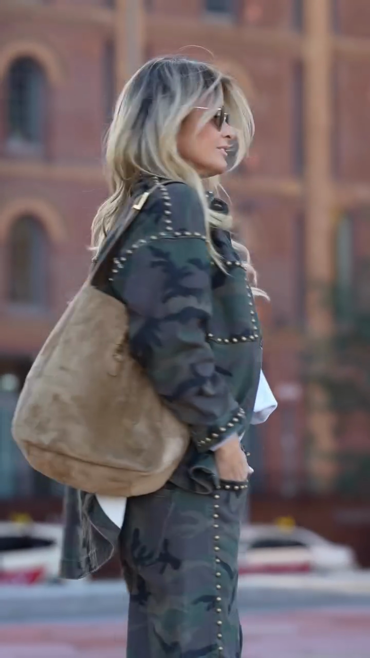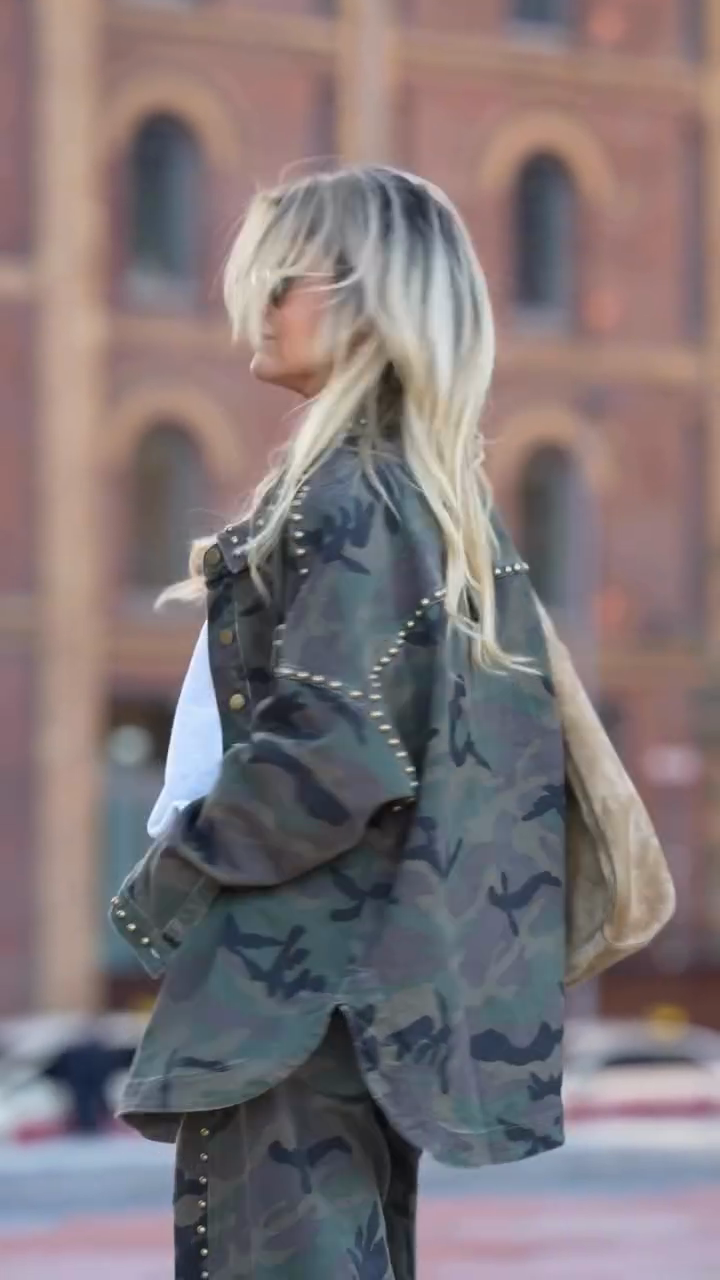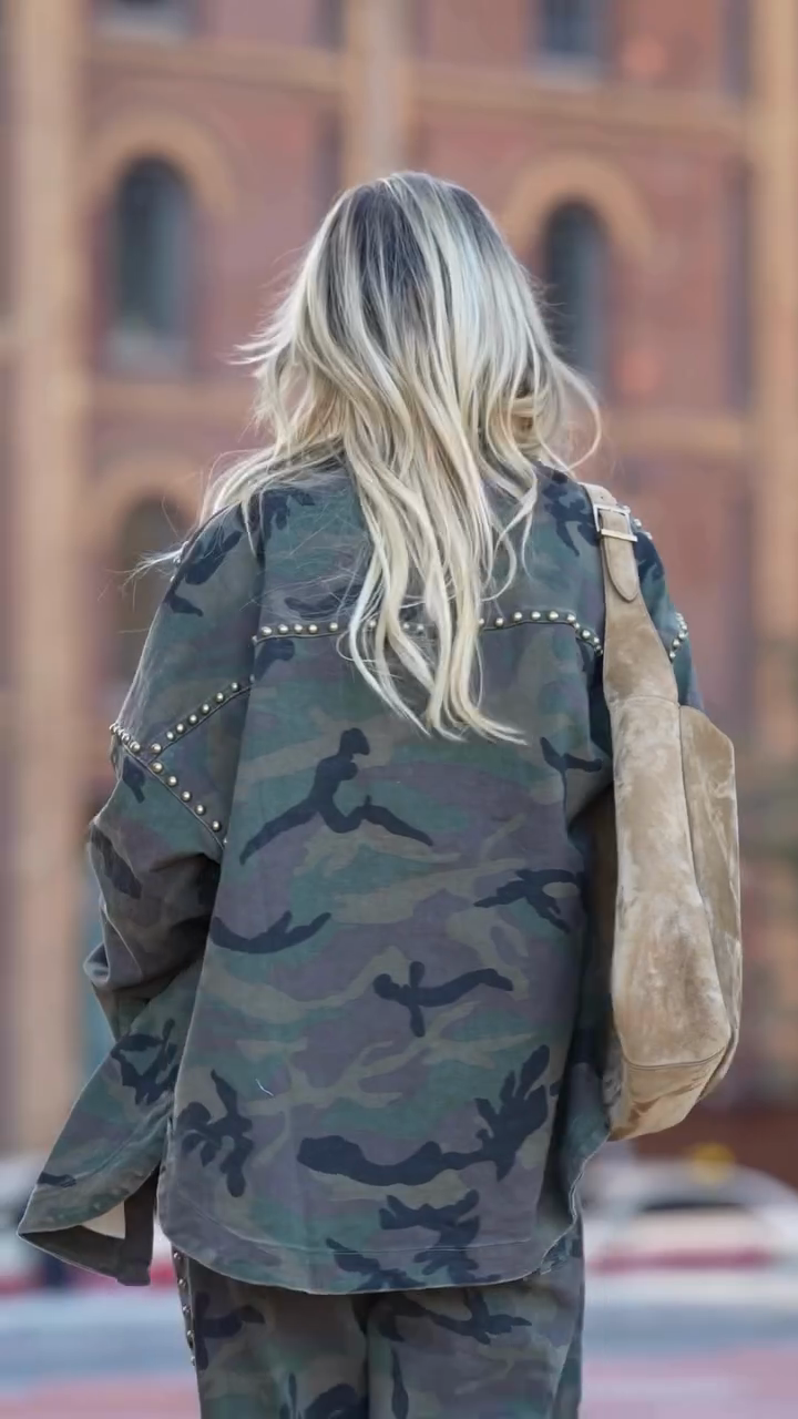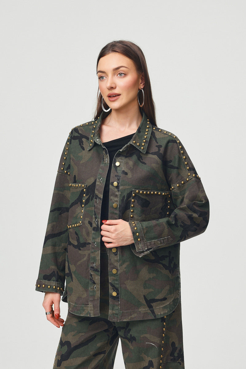 A camouflage-patterned overshirt jacket featuring gold stud trim, a relaxed oversized silhouette, and durable denim-blend fabric—merging rugged camouflage design with edgy metallic details for street-style casual or urban daily styling.