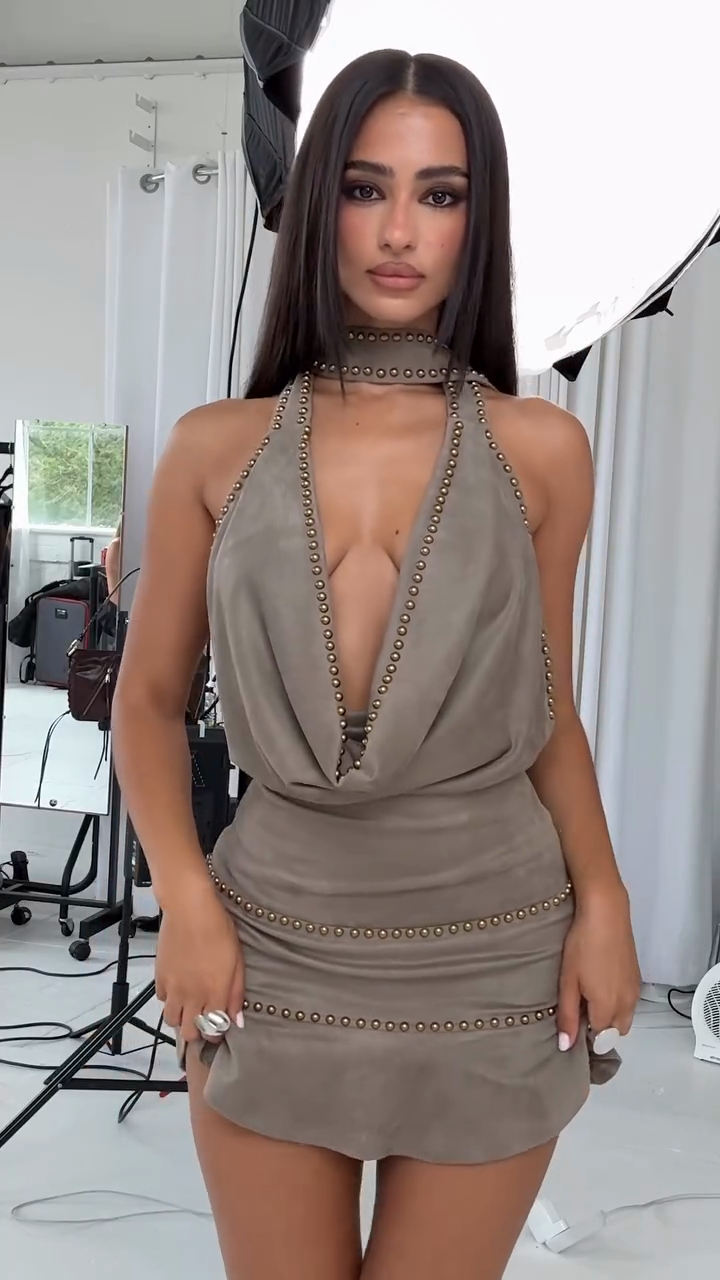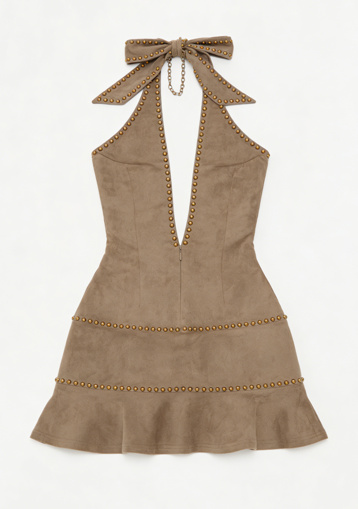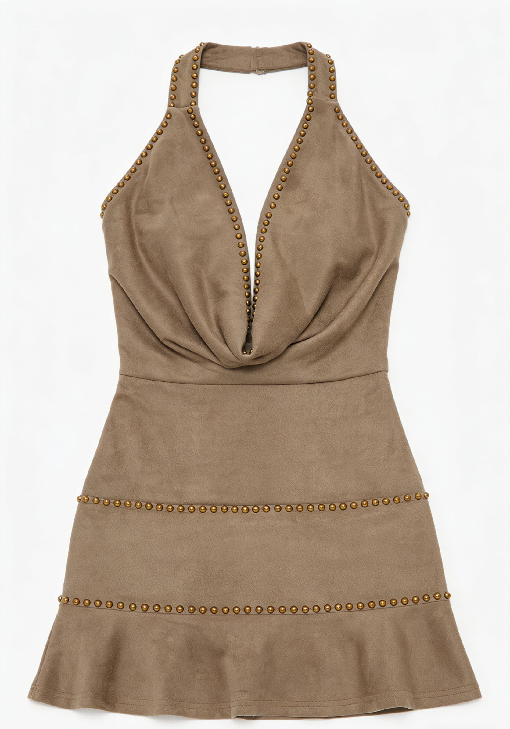 This taupe suede mini slip dress, adorned with gold studs, is designed to elevate a bold and glamorous look with a touch of luxury and effortless chic.