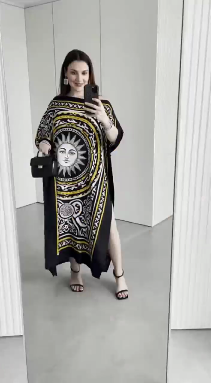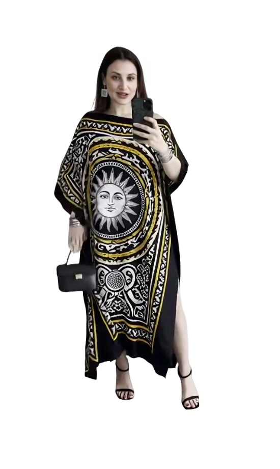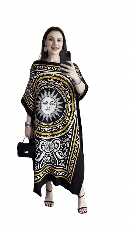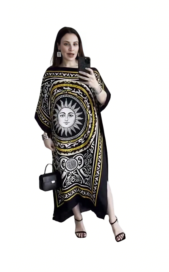 This loose-fitting dress features a sun print pattern, with bold graphic details and effortless charm that elevates the bohemian style.