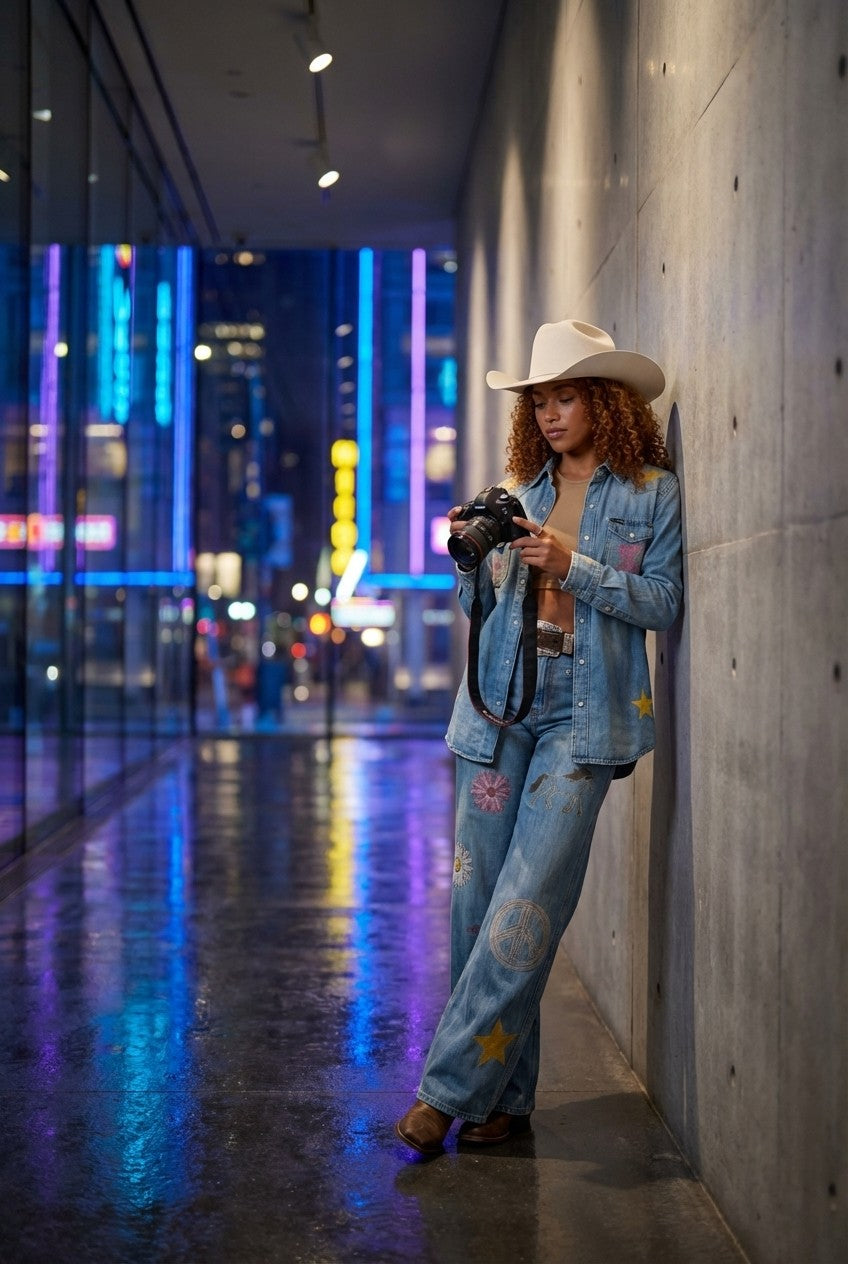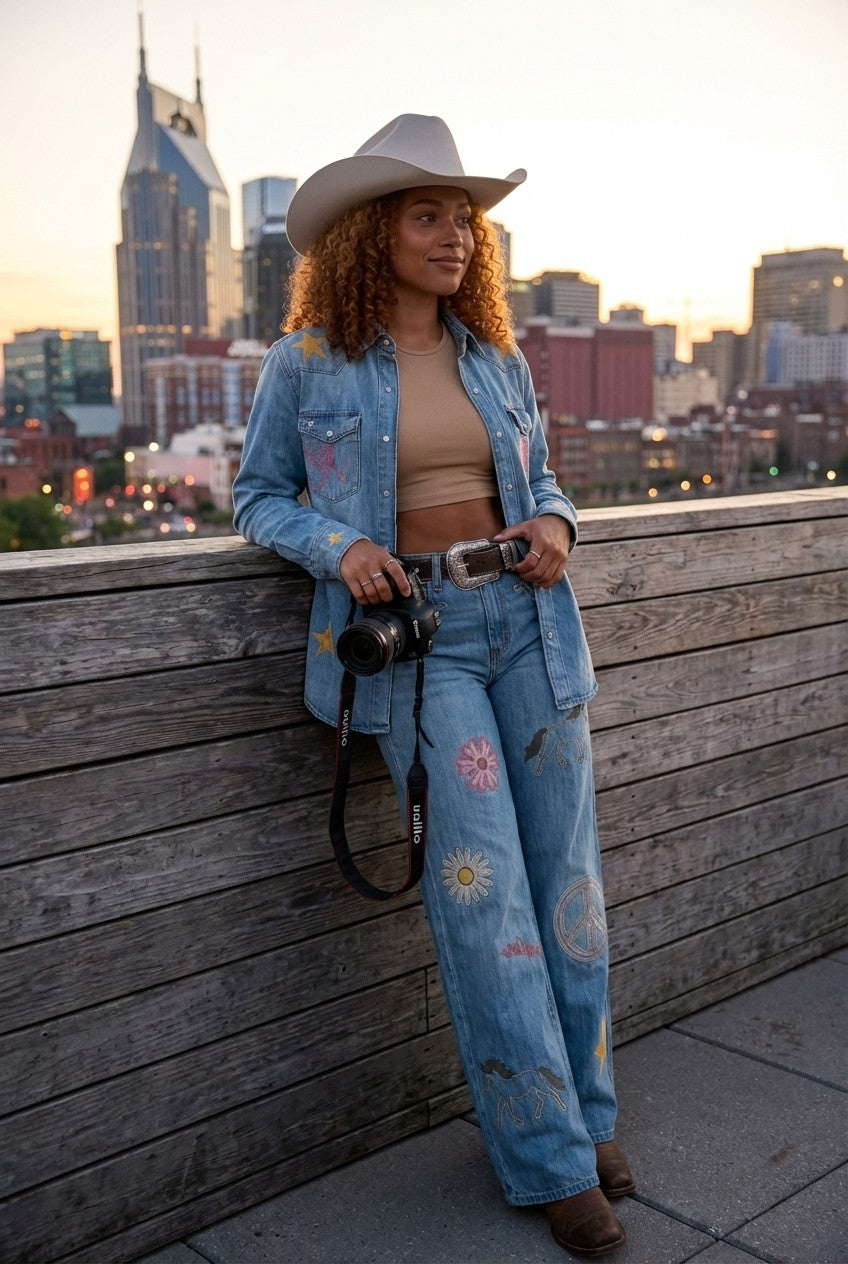 Whether you're exploring the city or heading to a country event, this denim set makes a statement with its bold western-inspired details.