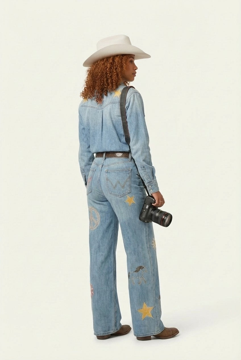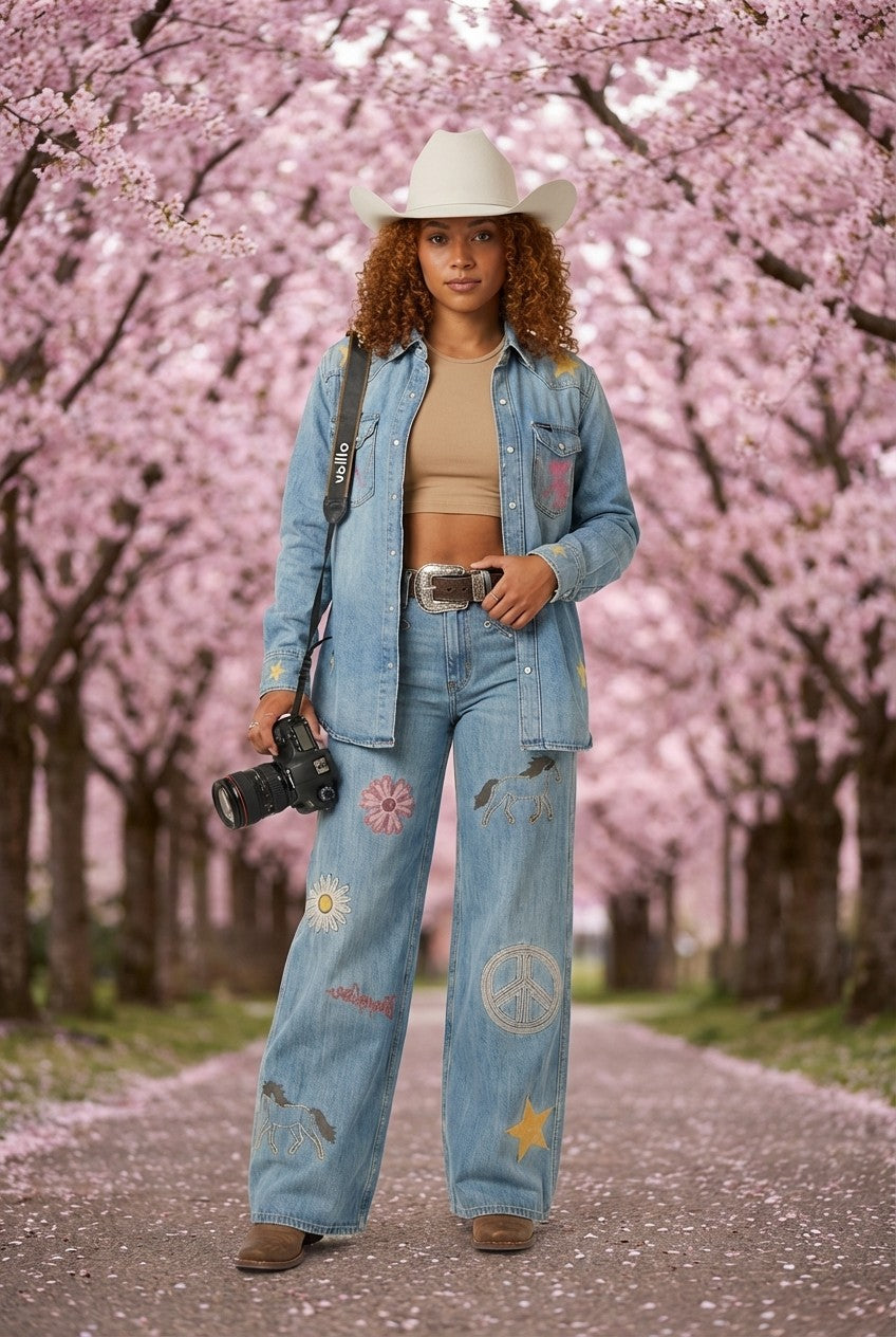 Bring effortless western charm to your wardrobe with this unique embroidered denim two-piece set. Featuring a classic denim shirt paired with wide-leg jeans decorated with playful embroidery, this outfit blends vintage cowgirl style with modern comfort.