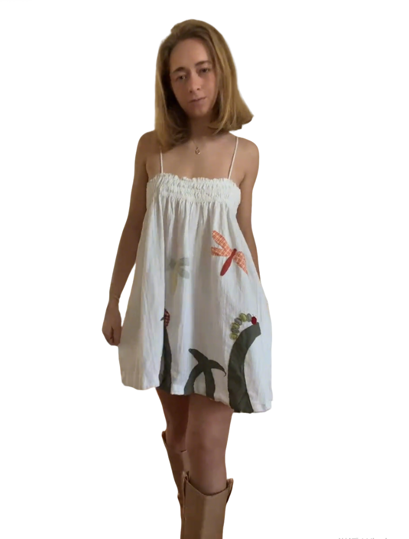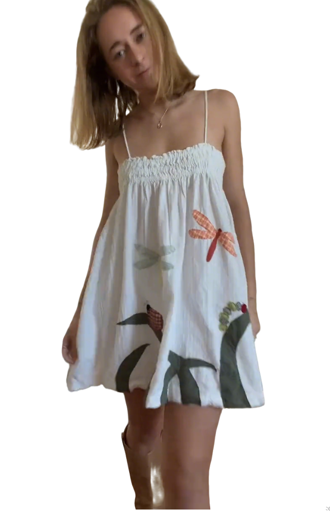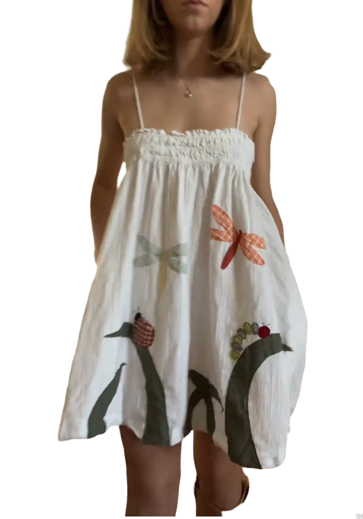 A white mini dress featuring thin cami straps, a smocked bust, and playful insect embroidery —merging lightweight cotton fabric with whimsical decorative details for casual daily or vacation styling.