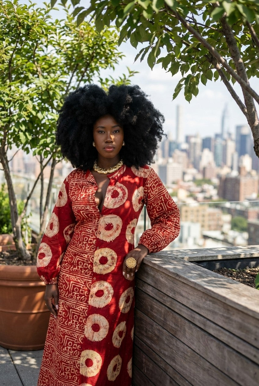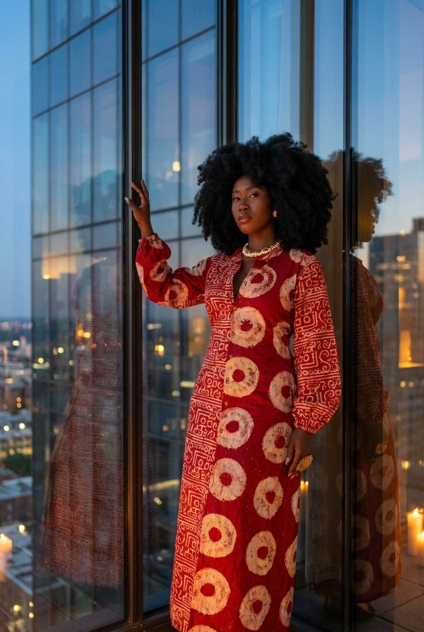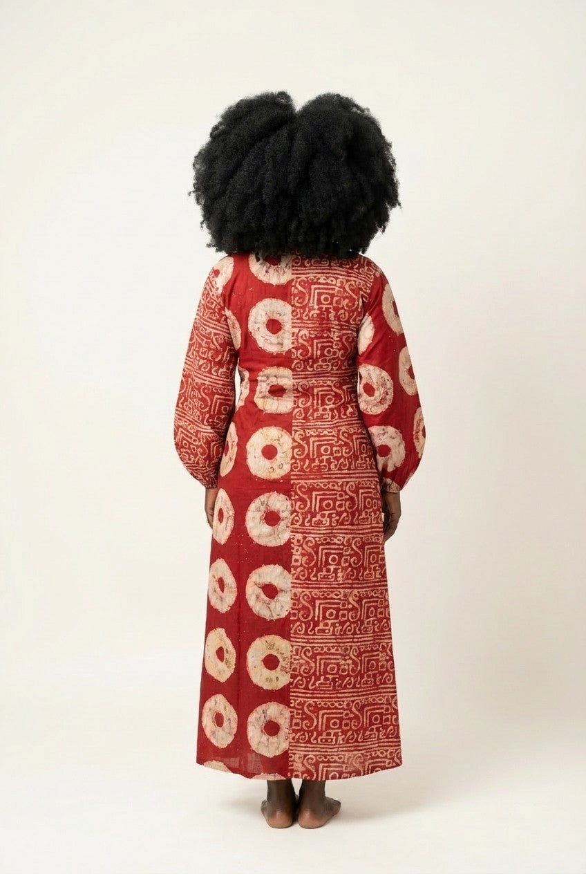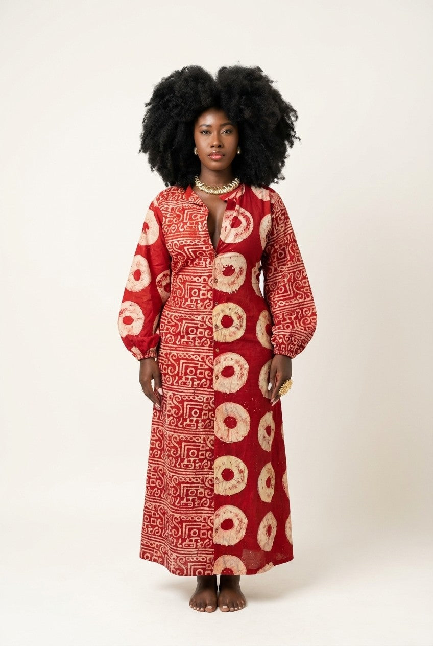 Celebrate heritage and modern style with this stunning maxi dress. Featuring a unique split-print design and a flattering button-down silhouette, it is a wearable piece of art designed for the bold and the sophisticated.