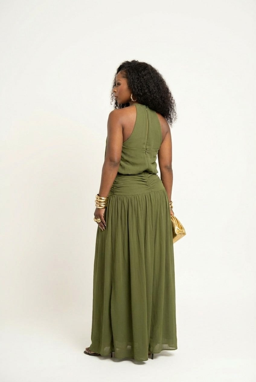 Command attention in timeless elegance. This stunning olive green maxi dress features a sophisticated halter neckline and a figure-flattering ruched waist, designed for moments that matter. Its flowing silhouette ensures you feel as graceful as you look.