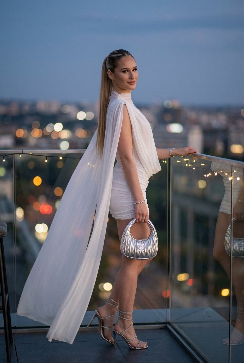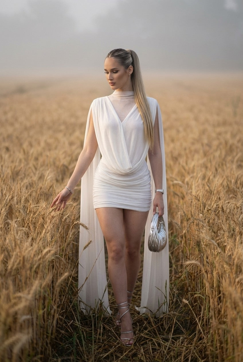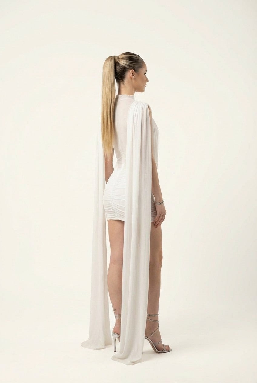 Exude ethereal elegance. This stunning white mini dress combines a sophisticated mock neck with dramatic cape sleeves for a look that commands attention at any high-end event.