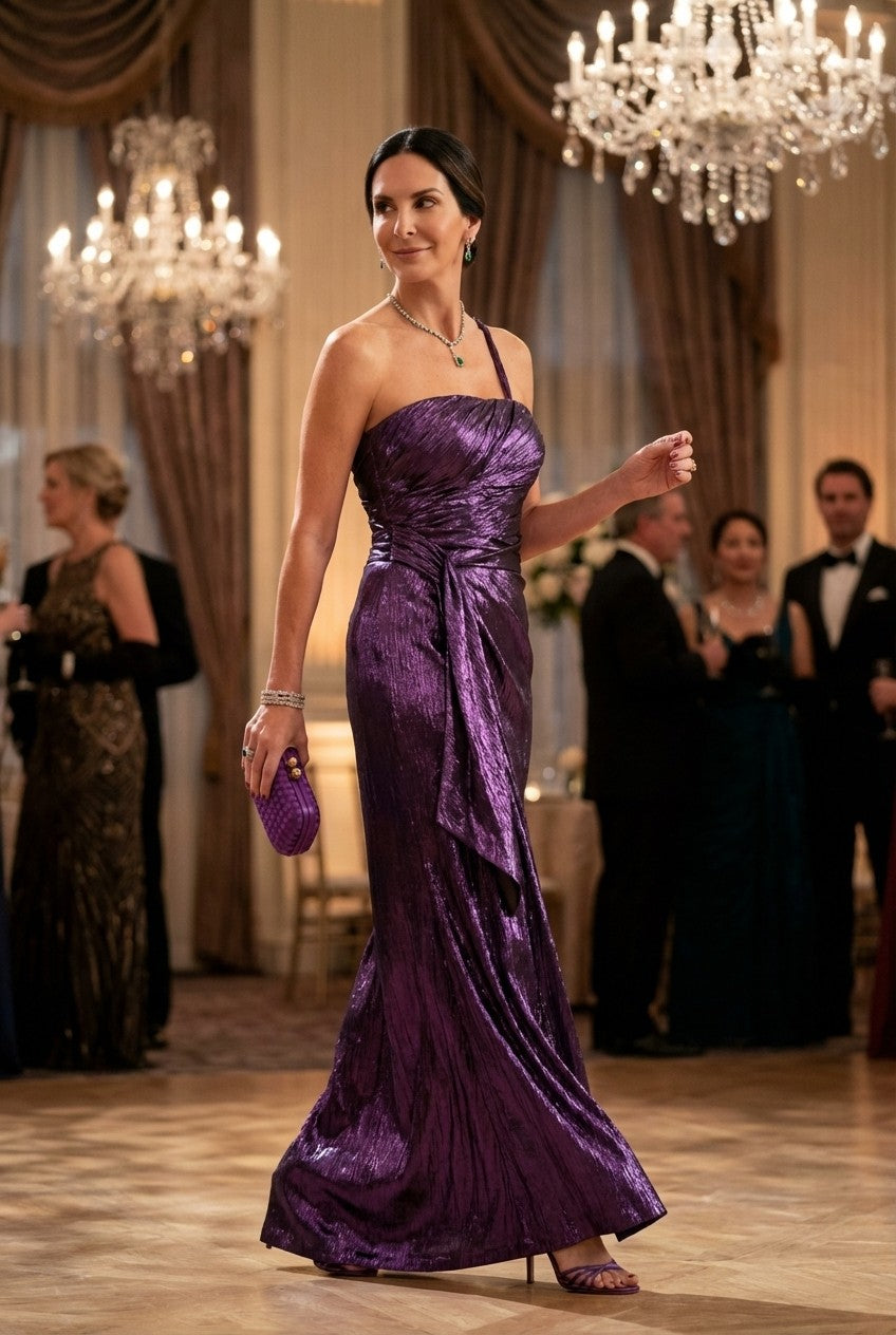 Radiate royalty in every step. This breathtaking metallic gown is designed to capture the light and every eye in the room with its luxurious shimmer and sophisticated silhouette.
