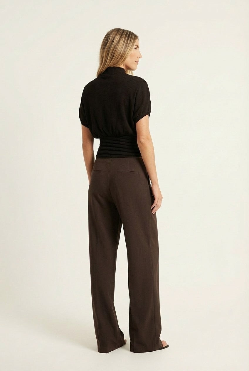 Modern sophistication meets daily ease. This coordinated set features a sophisticated mock-neck top with a striking smocked waist paired with fluid wide-leg trousers for a seamless, elevated look.
