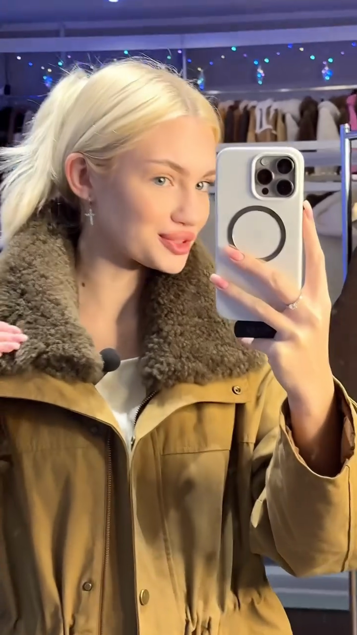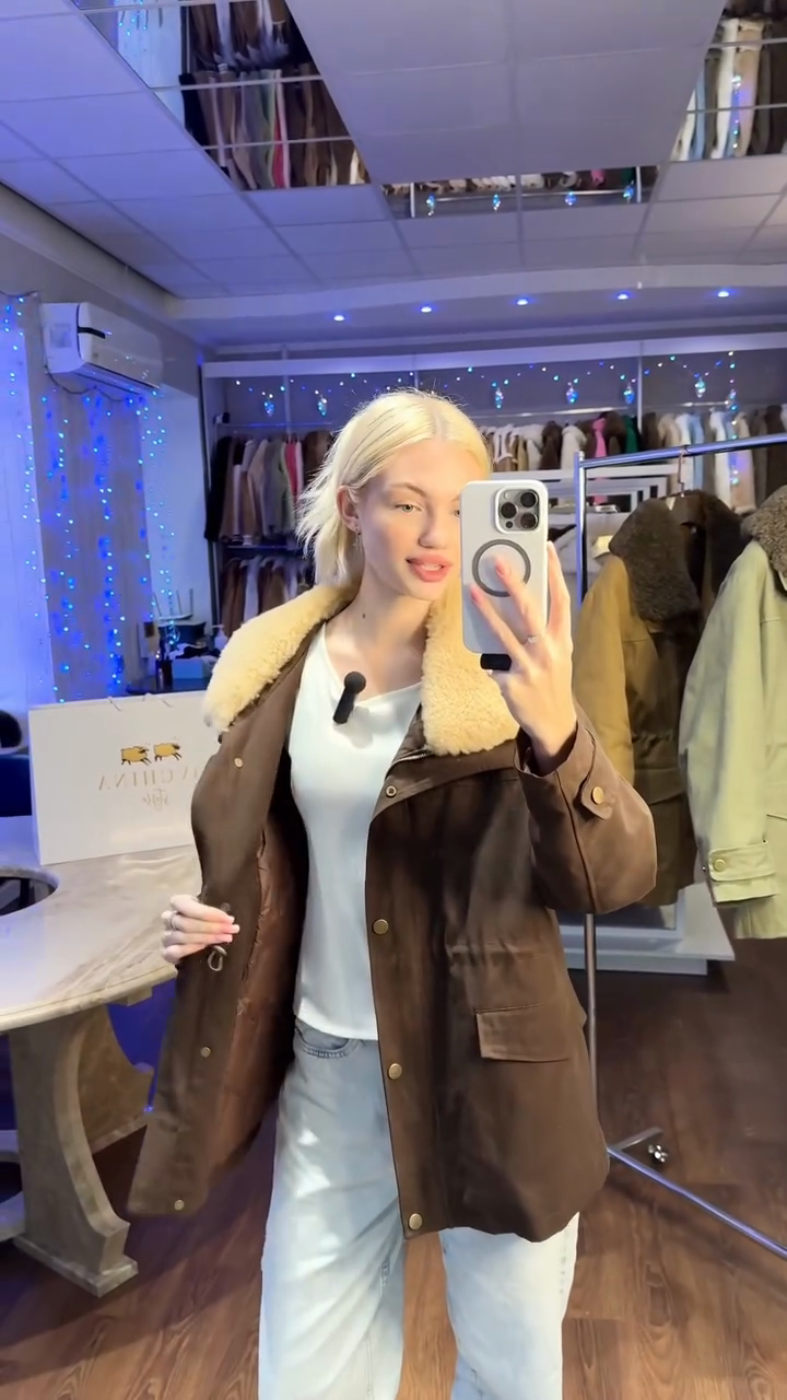 • Key Features: Plush shearling collar, adjustable waist drawstring